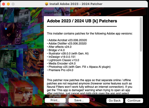 Этот патчер теперь исправляет приложения таким образом, что больше не требуются отдельные онлайн/оффлайн патчи (однако некоторые функции, например, нейрофильтры, не будут работать в полной мере без подключения к Интернету). Если при попытке открыть приложение после установки патча появляется предупреждение "Это приложение повреждено", просто отмените его, щелкните правой кнопкой мыши и выберите Open, чтобы создать исключение в Gatekeeper и разрешить запуск приложения. Это нужно сделать только один раз для приложений, выдающих такое предупреждение.