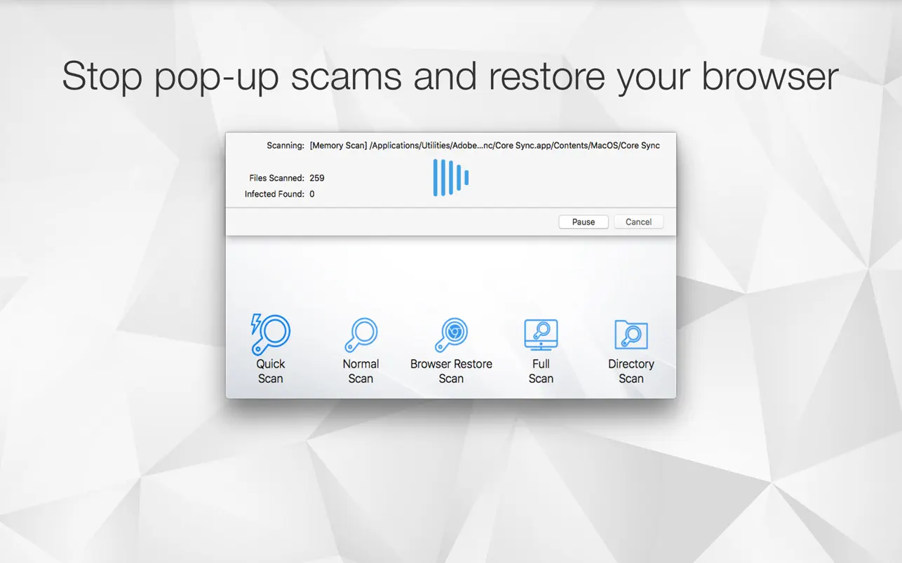 Сканирование + восстановление браузера: Аналогично быстрому сканированию, а также восстановление интернет-браузеров путем удаления расширений, файлов cookie и кэша.