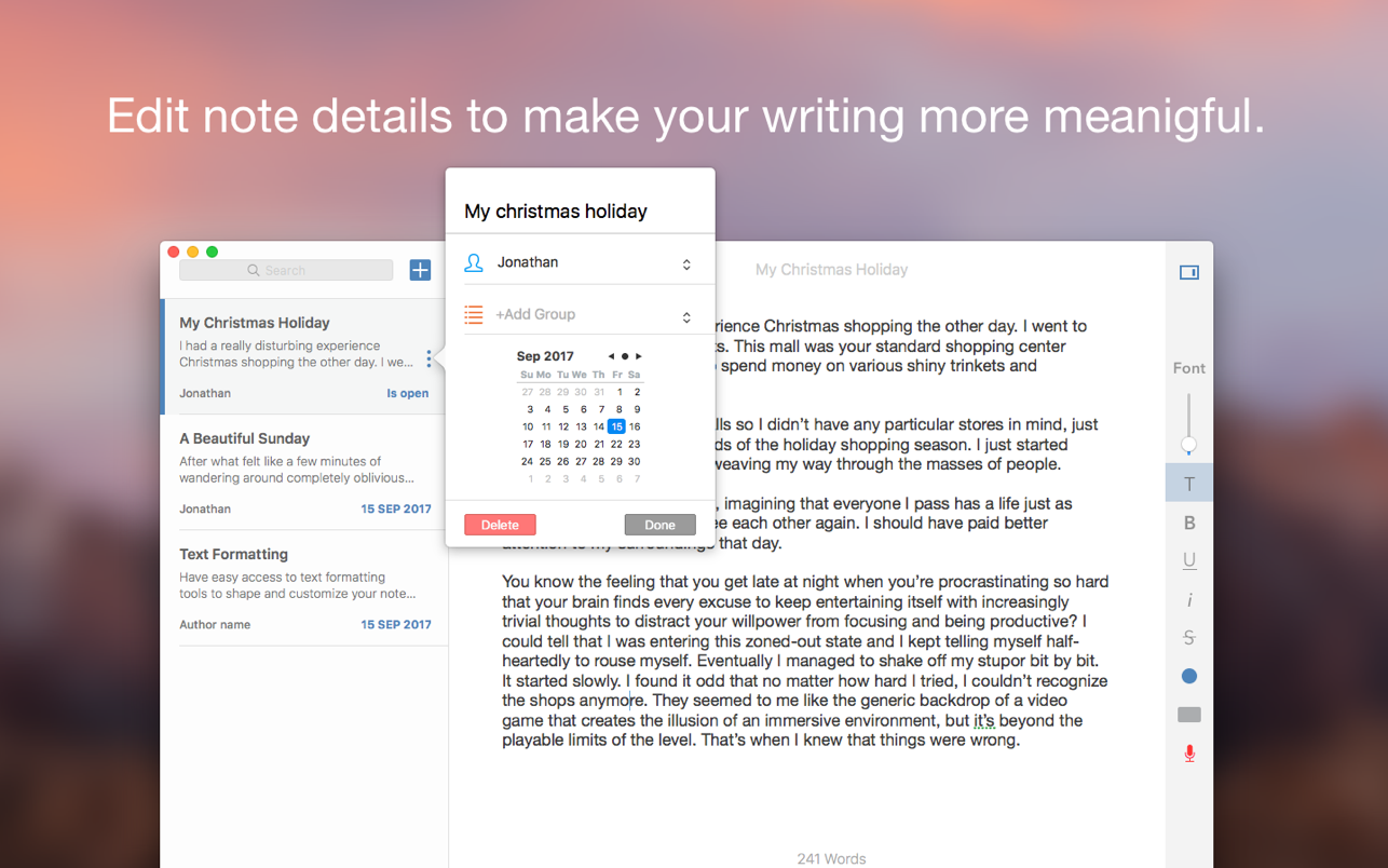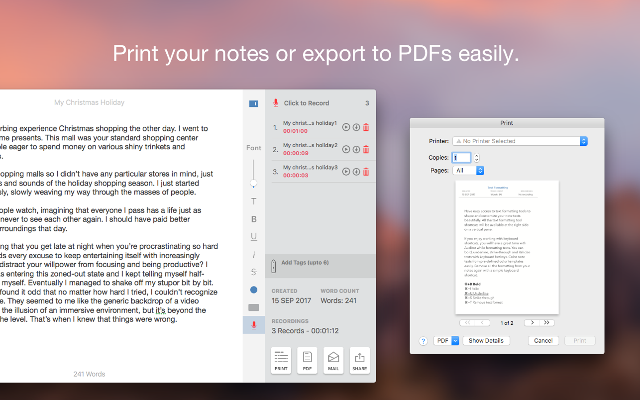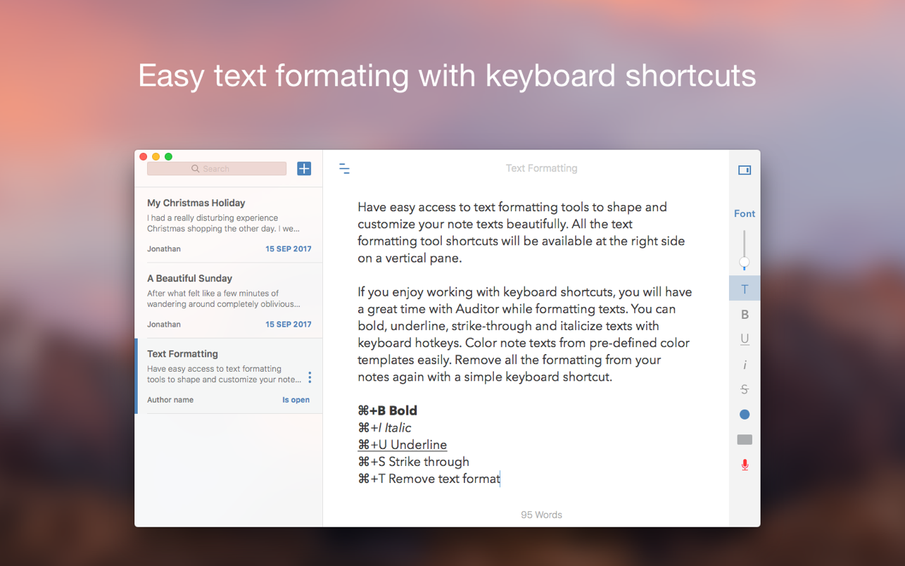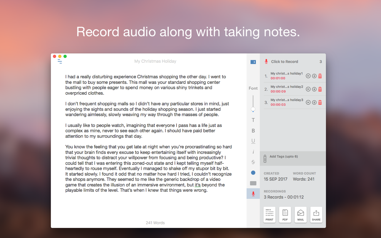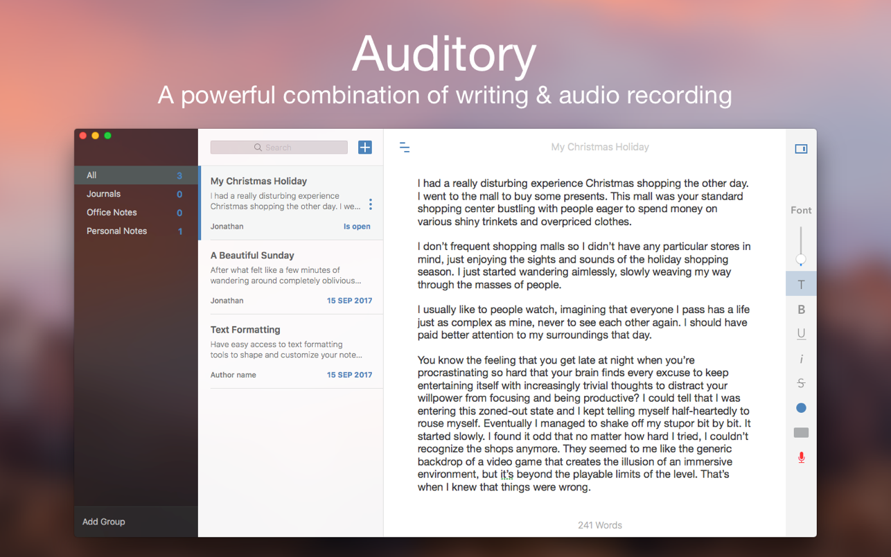 Описание: Auditory подарит вам самый безмятежный опыт письма на Mac. Вы будете писать на маслянистом гладком пользовательском интерфейсе с гладким и современным дизайном. Это уникальная комбинация записи и записи голоса в одном приложении. Он представляет собой интуитивно понятный интерфейс, в котором пользователи могут писать истории и записывать аудио одновременно. ОСНОВНЫЕ ФУНКЦИИ: