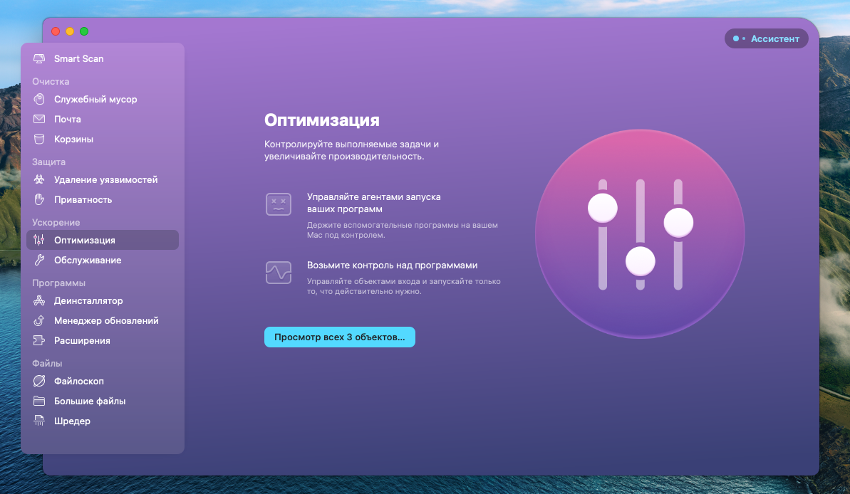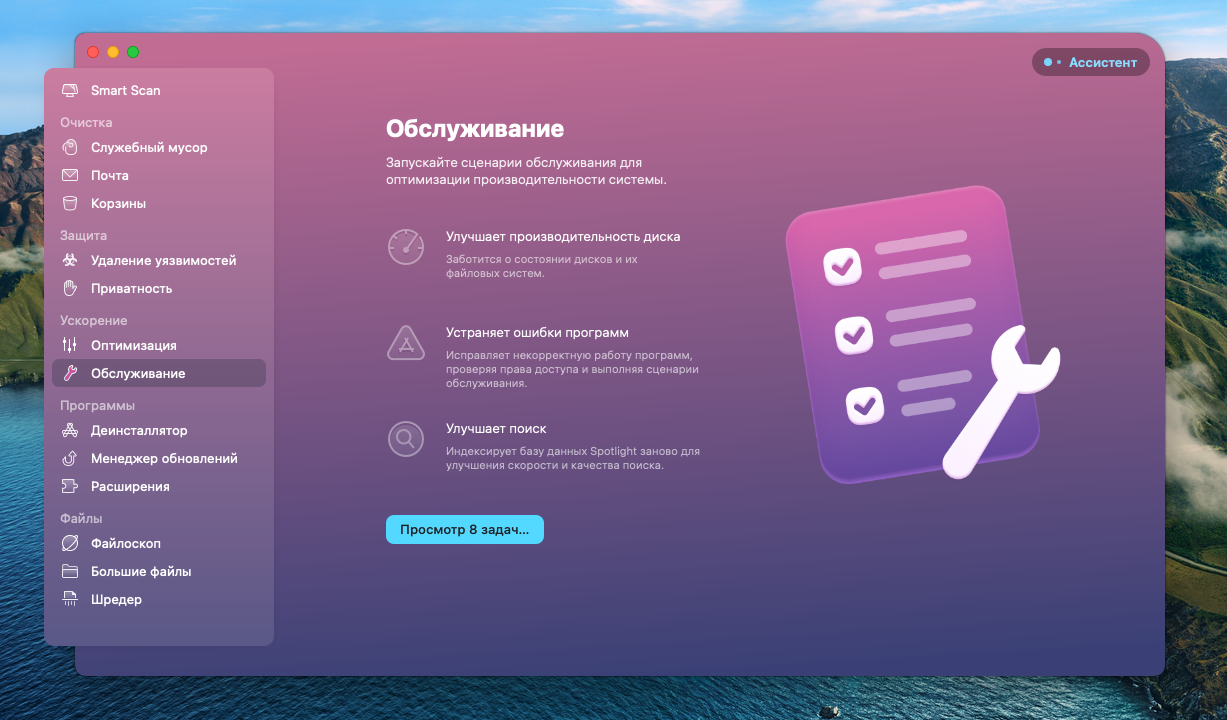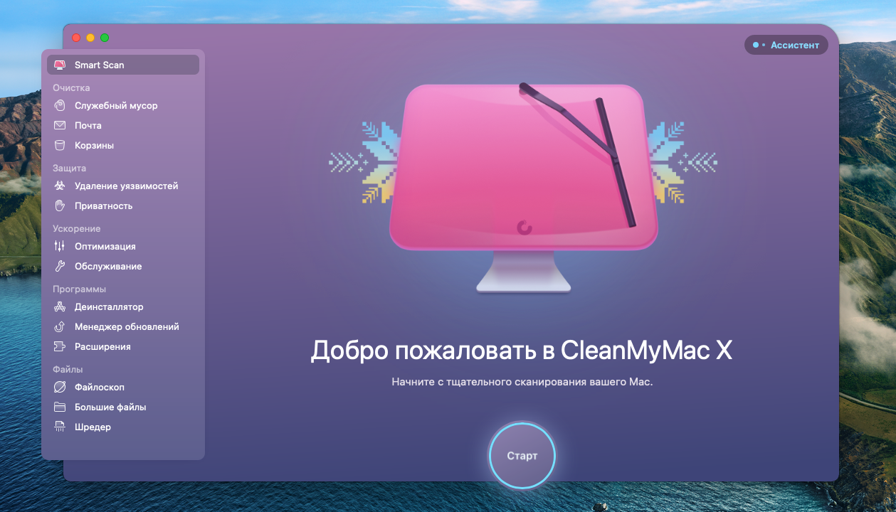 Познакомьтесь с вашим новым Ассистентом в CleanMyMac, который всегда готов помочь советом. Еще одним незаменимым инструментом является Меню CleanMyMac X, которое обеспечивает быстрый доступ к набору удобных панелей и задач – освобождению памяти RAM, тестированию сети и другим. Внешний вид и впечатление?