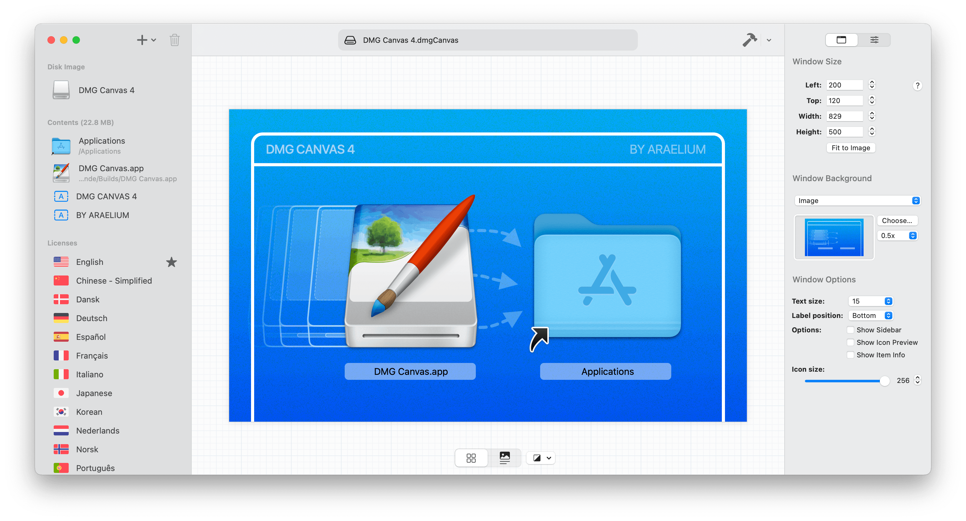 С помощью представления макета Background можно создавать великолепные фоны для образов дисков прямо в самом DMG Canvas. Просто вставьте изображения, добавьте текст - и все готово. ЛОКАЛИЗОВАННЫЕ ЛИЦЕНЗИИ