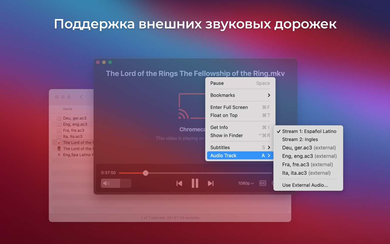 Выберите, какие внешние звуковые дорожки или файлы субтитров будет загружать проигрыватель: все с названием фильма, с тем же именем, что и у фильма, или все в каталоге. Потоковая передача локальных файлов на Chromecast, Apple TV, Smart TV и другие устройства с поддержкой AirPlay и DLNA.