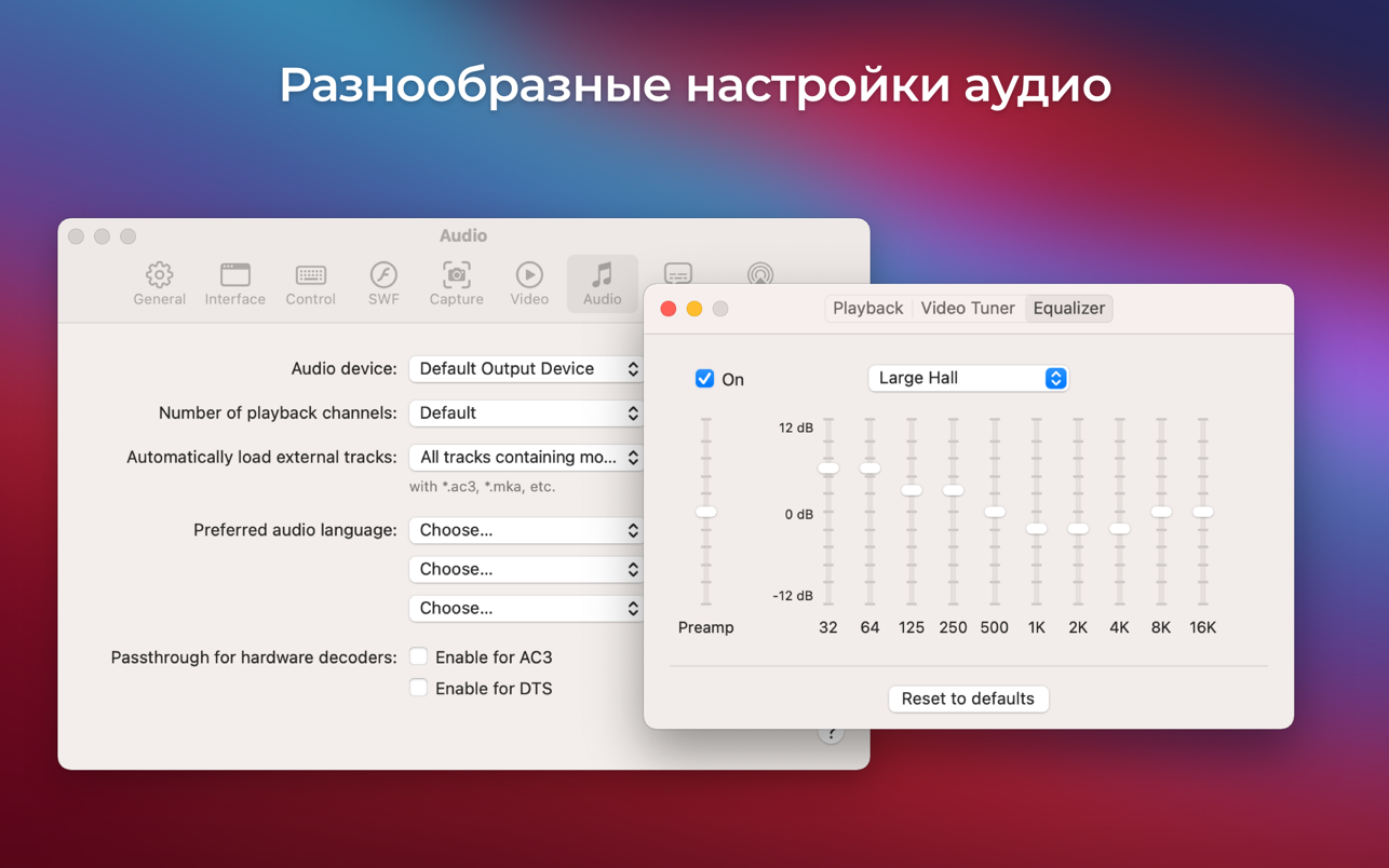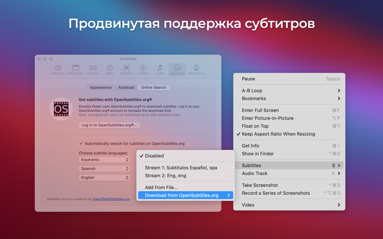 Мы интегрировали Elmedia Player с сервисом opensubtitles.org, что позволяет найти любые доступные там субтитры в пару кликов, не выходя из плеера. Гибкие настройки видео и аудио