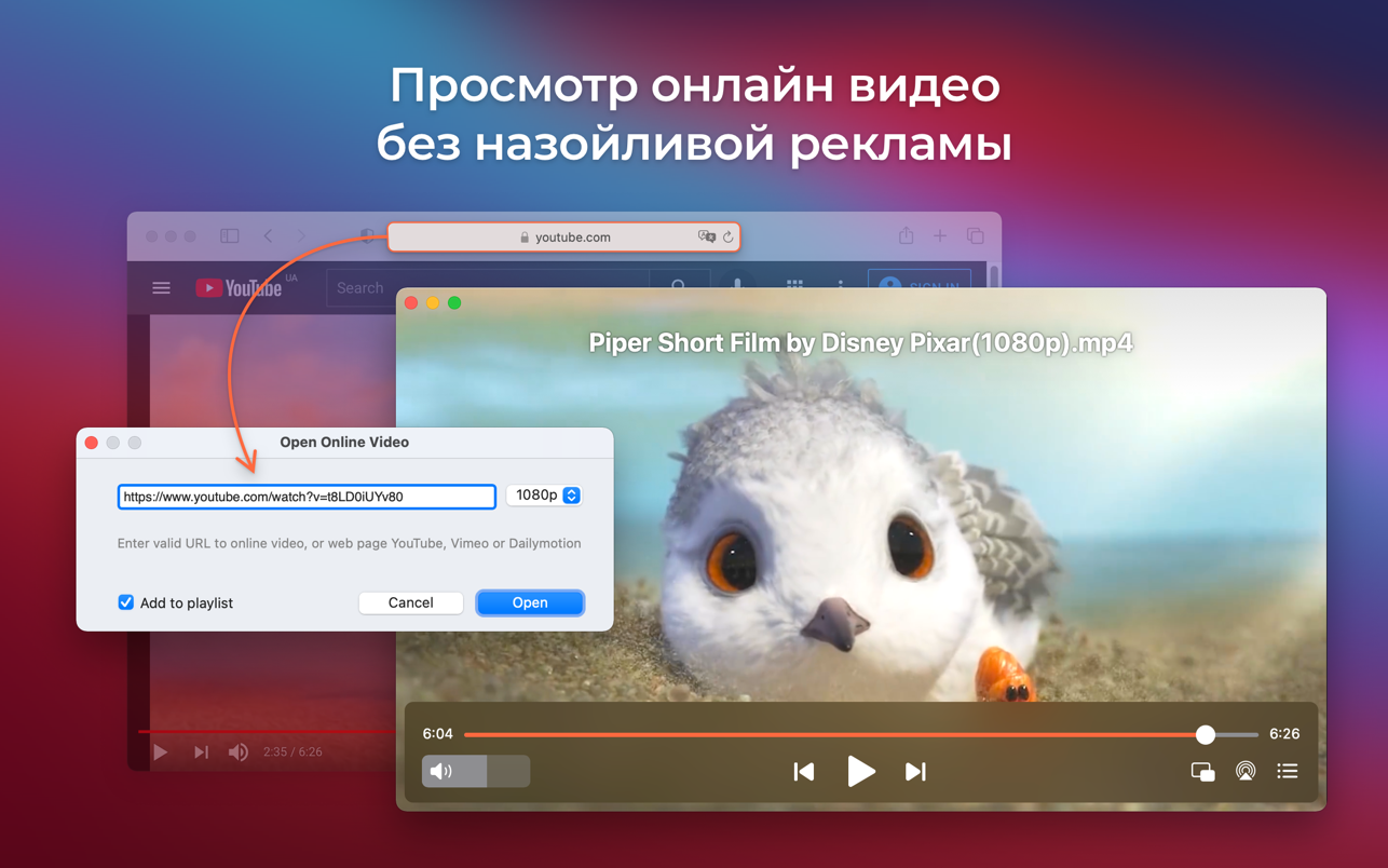 Транслирует контент с YouTube, Dailymotion и Vimeo без рекламы (через опцию «Открыть онлайн-видео»).