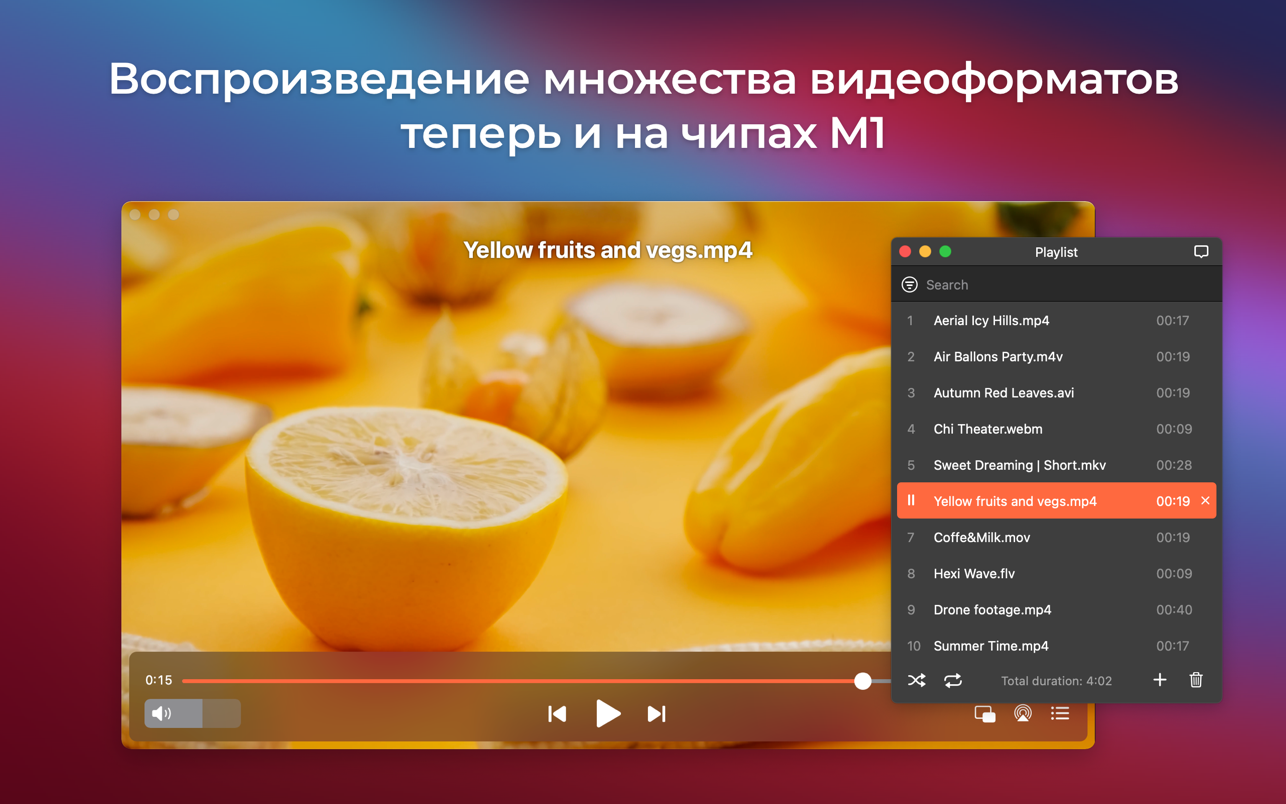 Elmedia Player Pro Год выпуска: 2023 Версия: 8.14 Разработчик: Eltima Архитектура: ARM, х86 (64-bit) Язык интерфейса: русский + английский Таблэтка: TNT Системные требования: macOS 10.12 или новее Описание: Elmedia Video Player - медиаплеер для macOS. Он может воспроизводить практически любой тип файлов, будь то AVI, MP4, FLV, SWF, WMV, MKV, MP3, M4V и т. Д. Elmedia Video Player - это универсальное решение, которое не требует дополнительных плагинов или кодеков. . Этот проигрыватель предлагает своим пользователям прекрасные возможности HD благодаря встроенному аппаратному ускорению декодирования, которое разгружает процессор и выводит на экран плавное и чистое видео. Производительность еще больше повышается за счет поддержки чипа M1. Особенности: