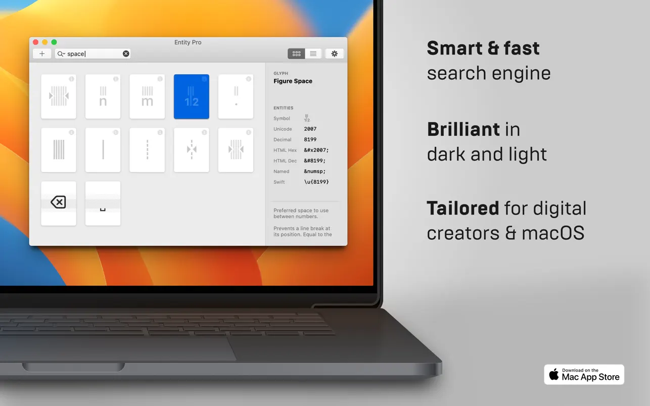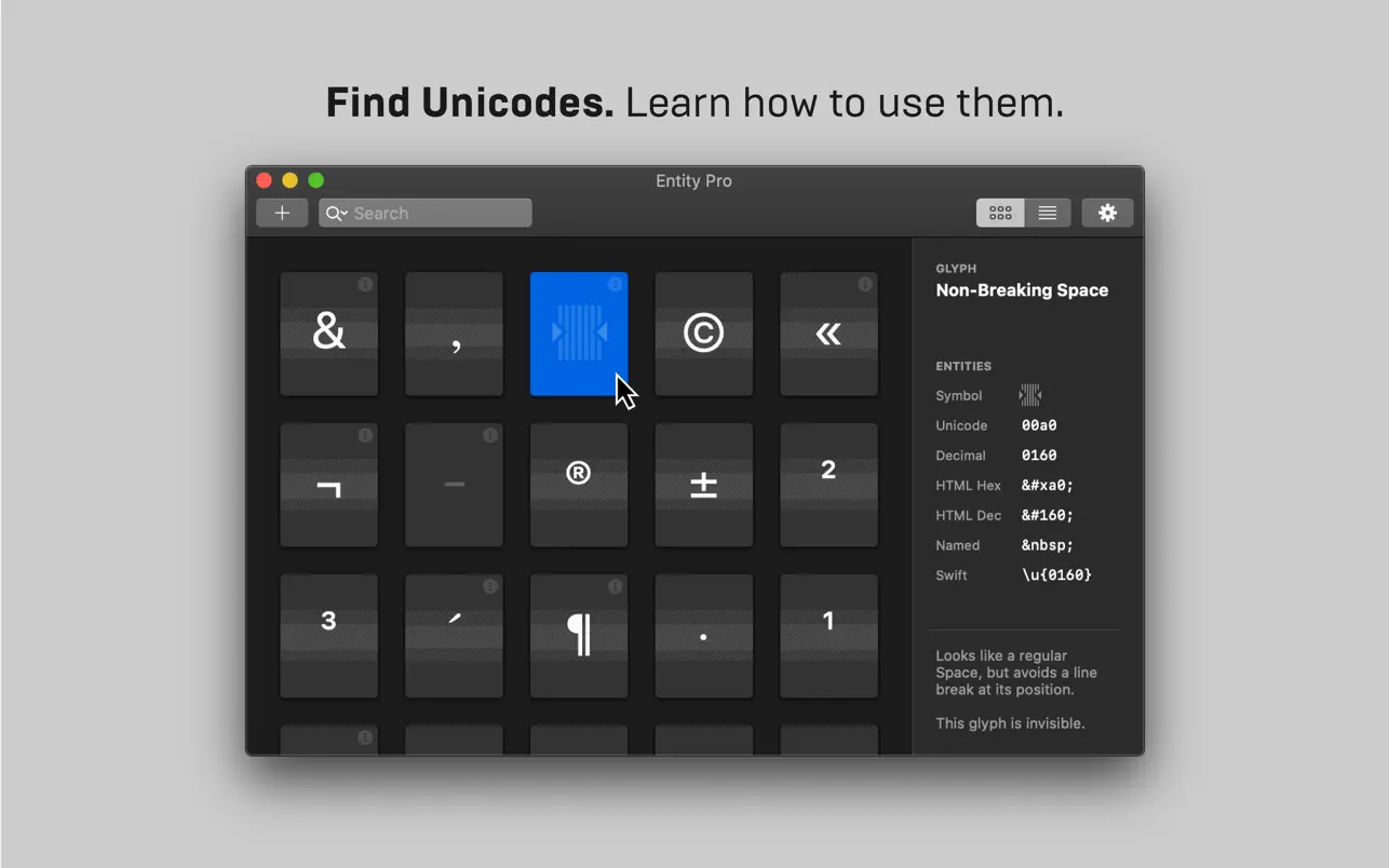 Описание: Программа Entity Pro снята с производства. Он по-прежнему отлично работает на macOS 11+, поэтому пока остается доступным здесь. Его преемник, Codepoint, находится в активной разработке. Entity Pro - это лучшая программа для поиска юникода для macOS, предназначенная для типографов. Интеллектуальный поиск, быстрое копирование и изучение цифровой типографики. Особенности: