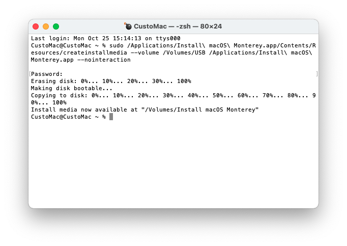 sudo /Applications/Install\ macOS\ Big\ Sur.app/Contents/Resources/createinstallmedia --volume /Volumes/USB /Applications/Install\ macOS\ Big\ Sur.app --nointeraction