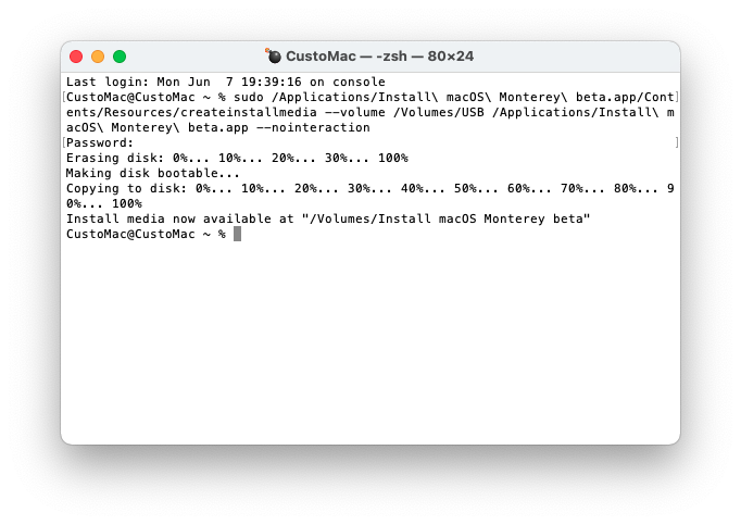12. Введите следующее, введите пароль и нажмите enter. Эта команда полностью стирает USB, а затем создает собственный установочный носитель из приложения Install mac OS Beta.