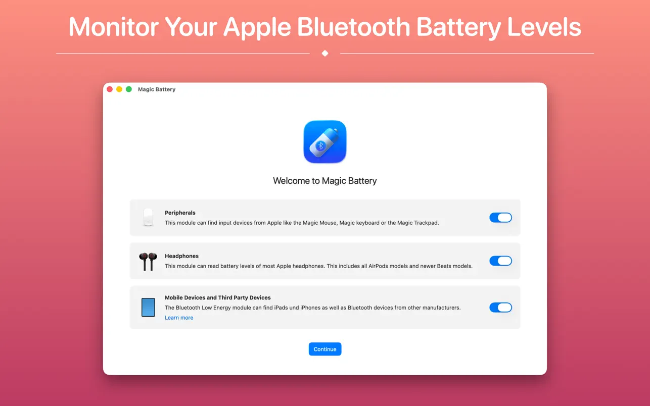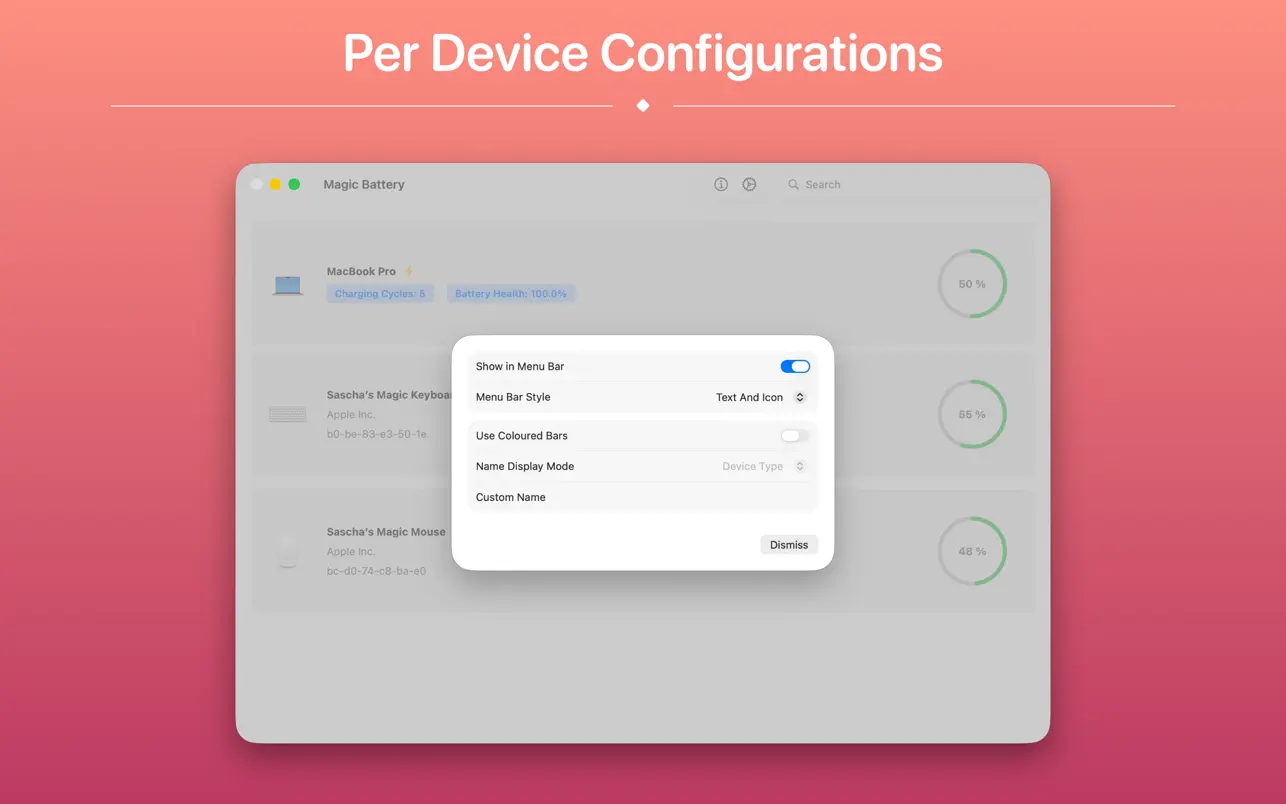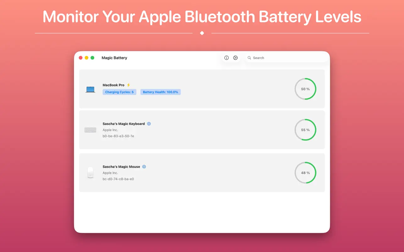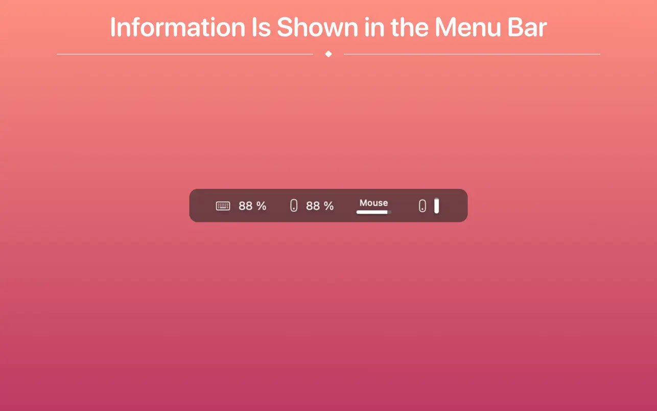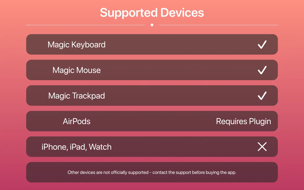 Описание: Приложение Magic Battery отображает в строке меню уровень заряда батареи поддерживаемых устройств ввода и наушников, подключенных по Bluetooth. Поддерживаются также внутренние аккумуляторы. Поддерживаются следующие устройства: Устройства ввода: