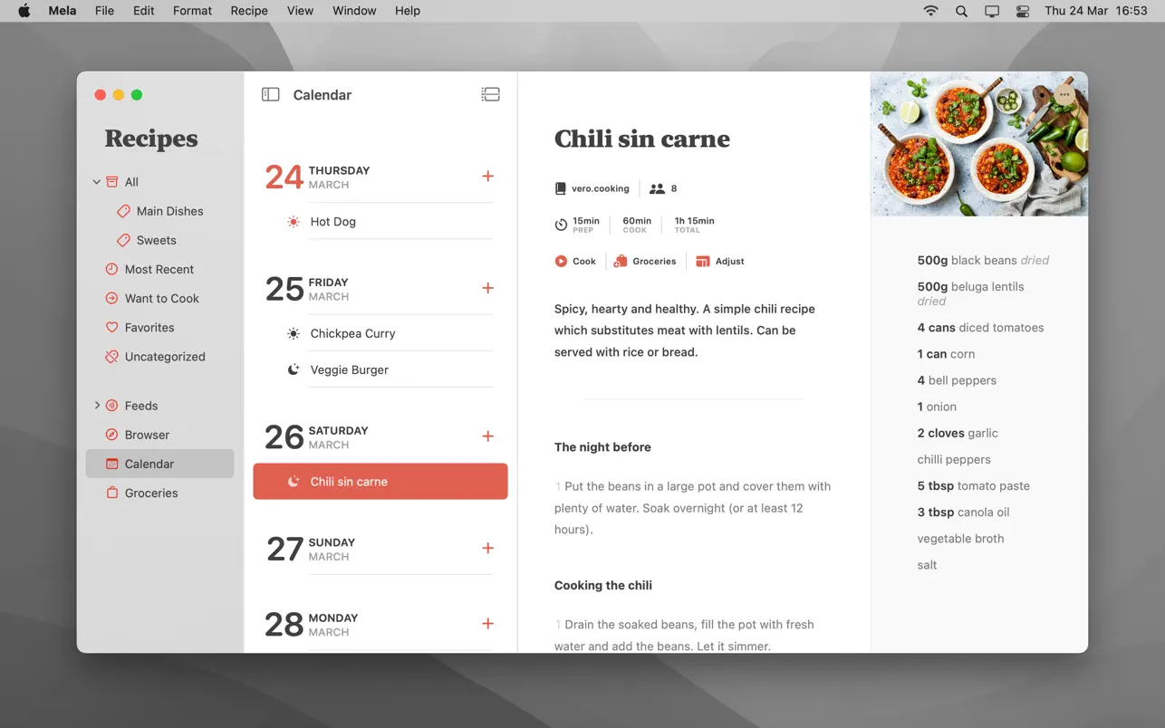 Для планирования питания используйте встроенный в Mela календарь. Он управляется приложением Calendar.app, преимущество которого заключается в том, что вы всегда можете получить доступ к нему на всех устройствах. Также есть виджет, показывающий следующий запланированный прием пищи из календаря. ОРГАНИЗАЦИЯ
