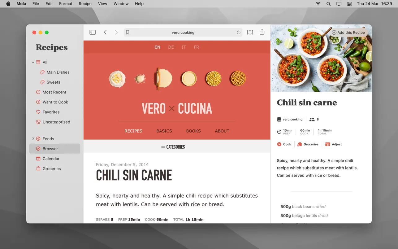 Отсканируйте рецепт из книги: С помощью функции распознавания текста вы можете просто добавить его в свою личную коллекцию и просмотреть в родном приложении Mela для просмотра рецептов, как любой другой рецепт. Списком продуктов