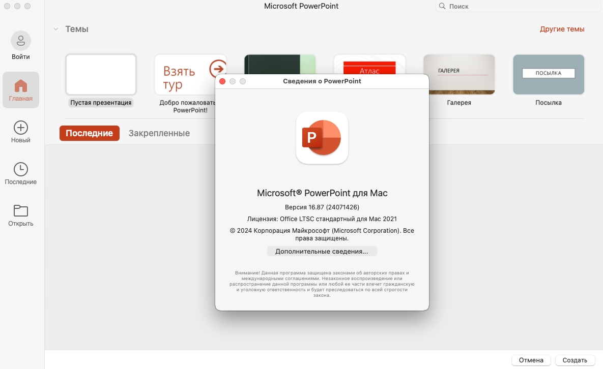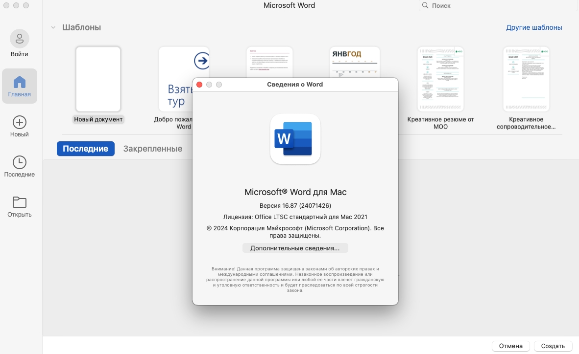 Microsoft Office 2021 Год выпуска: 2024 Версия: 16.87 (24071426) Разработчик: Microsoft Corporation Платформа: Intel/Apple Silicon Universal Язык интерфейса: Русский, English, العربية, 中文, Čeština, Dansk, Nederlands, Suomi, Français, Deutsch, Ελληνικά, עברית, Magyar, Bahasa Indonesia, Italiano, 日本語, 한국어, Norsk, Polski, Português, Slovenčina, Español, Svenska, ภาษาไทย, Türkçe Таблэтка: Патч Системные требования: