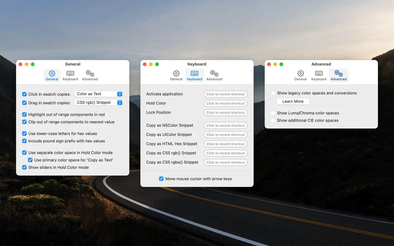 • Копировать цвет как текст, изображение или как фрагмент кода NSColor / UIColor / HTML / CSS.