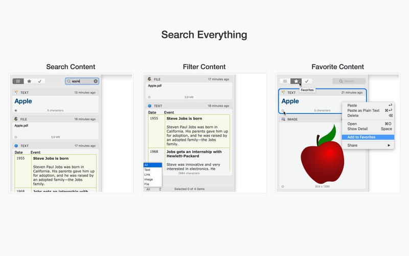 Утилита позволяет: вставить или удалить контент с помощью жестов, вставить содержимое прямо в текущее приложение, вставить текст с форматом или без него, вставить последний контент по ярлыкам Cmd + 1 .. Cmd + 9. вставить, удалить большое количество содержимого буфера обмена за один раз, предварительно просмотреть содержимое любого тип, найти и отфильтровать содержимое - текстовый поиск и фильтрация содержимого по типу контента и многое другое Скриншоты: