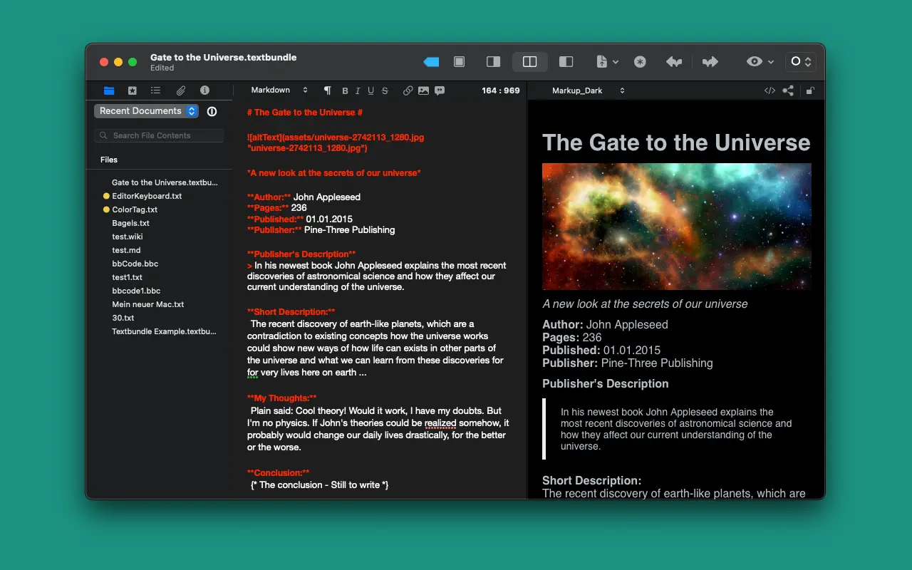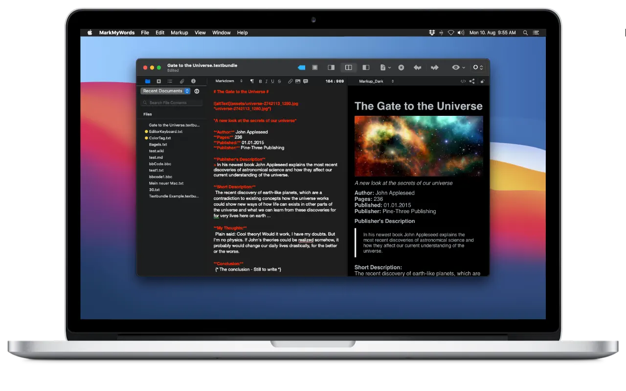 MarkMyWords поддерживает языки разметки BBCode, Markdown, MultiMarkdown, MarkdownExtra, Smark, Textile и Wikitext и предлагает предварительный просмотр форматированного вывода, который будет немедленно отображаться на веб-страницах. Конечно, вы также можете использовать обычный HTML для форматирования текста. [ Страница в mac app store ] Скриншоты: