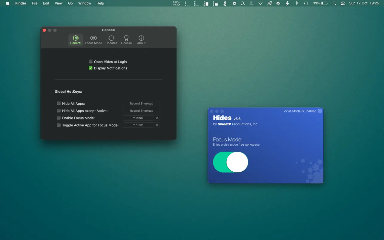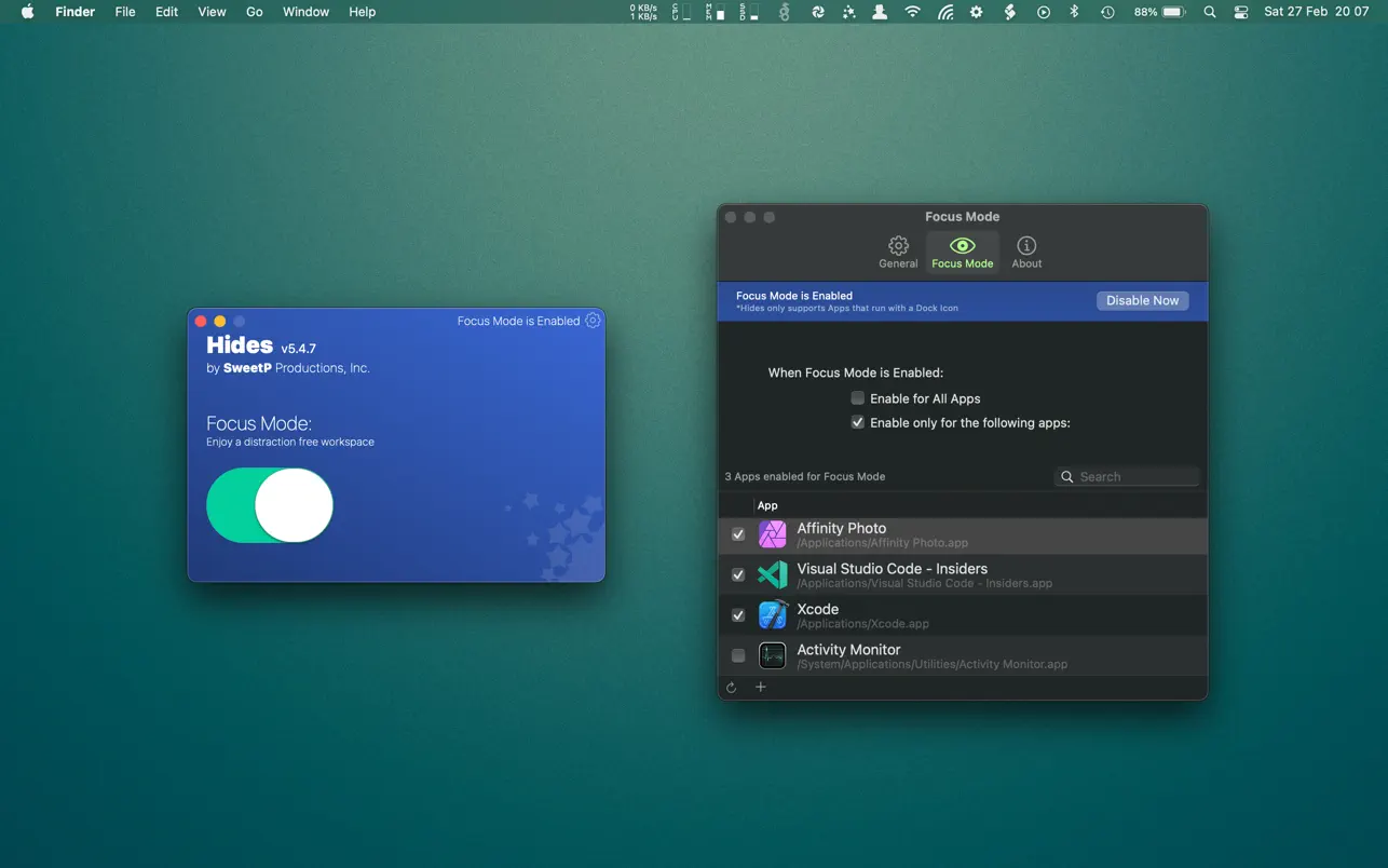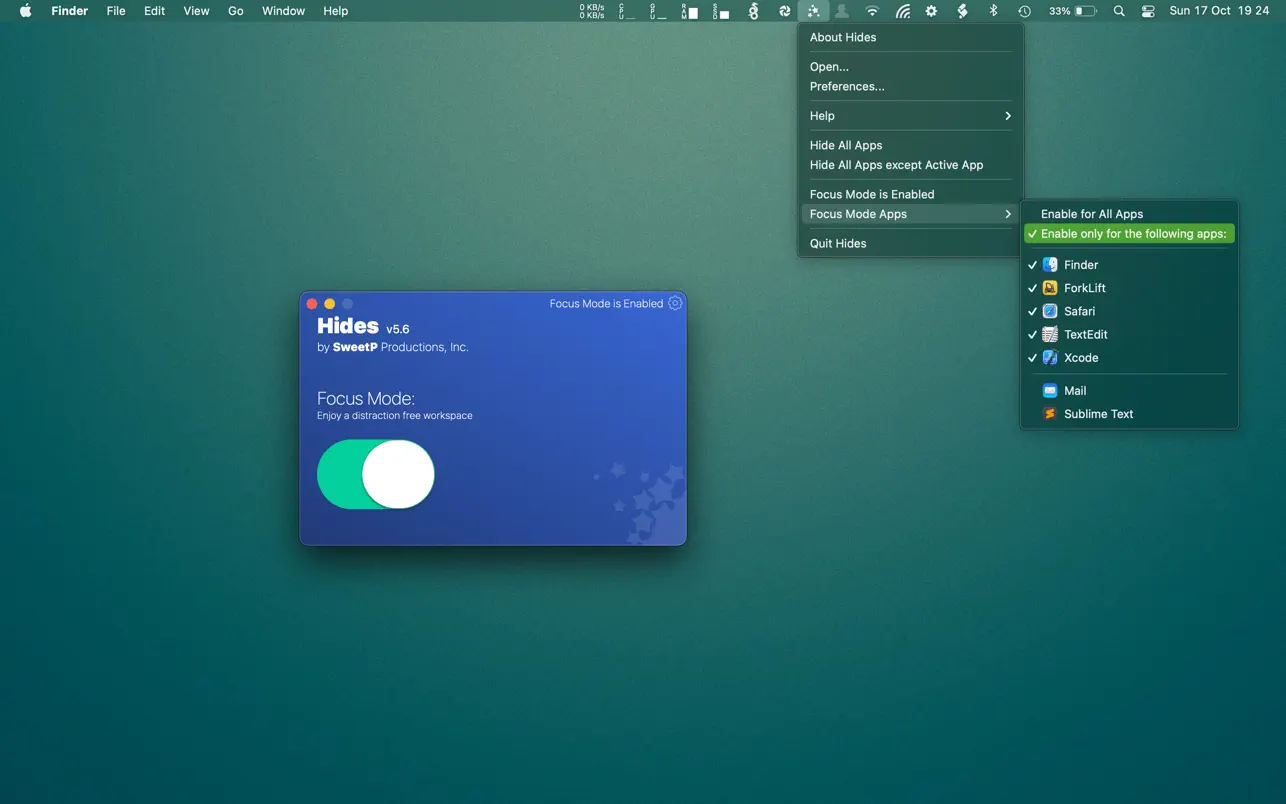 всякий раз, когда вы нажимаете на значок приложения (или окно) в доке, все другие приложения мгновенно скрываются из поля зрения. Это создает свободное от отвлекающих факторов и, в конечном итоге, более продуктивное рабочее пространство. Режим фокусировки можно настроить только для определенных приложений или глобально для всех приложений, и его легко настроить в настройках. Особенности: