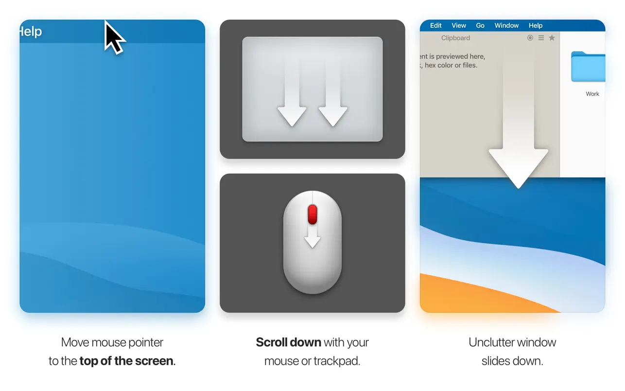 Описание: Unclutter — новое удобное место на рабочем столе для хранения заметок, файлов и клипов монтажного стола. Чтобы открыть его, просто переместите указатель в самый верх экрана и прокрутите вниз. Перетащите элементы из других приложений в верхнюю часть экрана, чтобы сохранить их в Unclutter. Основные возможности:
