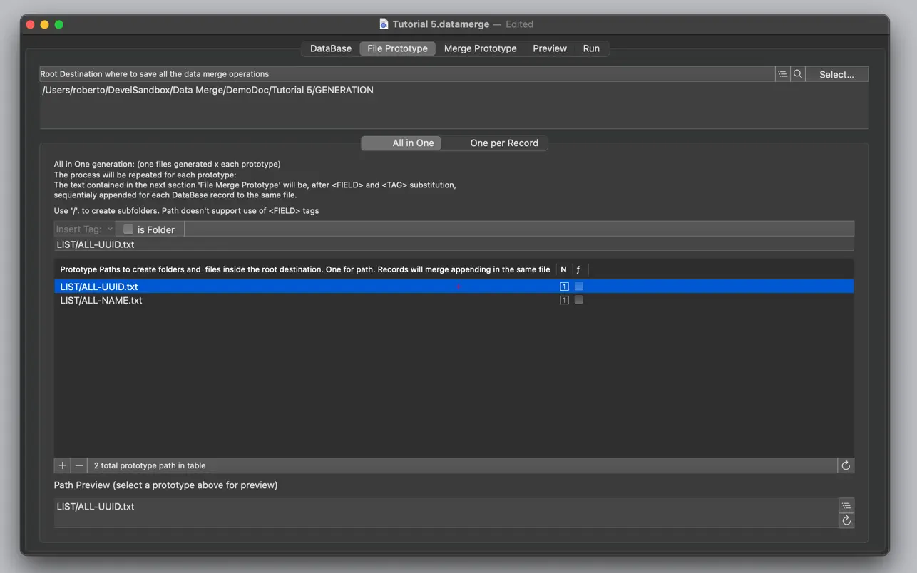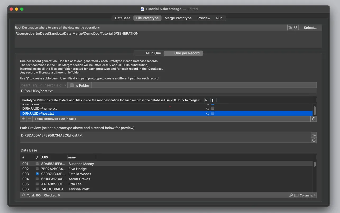 Описание: Data Merge может генерировать, начиная с таблицы данных и группы прототипов путей и текстовых форм, серию файлов на диске, где содержимое файлов и даже конечные пути создаются, комбинируя значение FIELDS внутри таблицы данных с прототипом текста и путей. Что вы можете получить