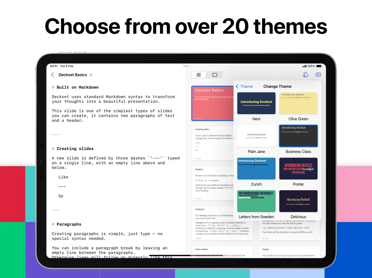 Описание: Deckset — это новый простой способ создания презентаций. Откройте свой любимый текстовый редактор, запишите свои мысли, а Deckset превратит их в красивые презентации. Сосредоточьтесь на своих идеях, а не на разработке слайдов. Deckset включает в себя десять потрясающе выглядящих тем, которые подойдут любой аудитории, будь то деловая встреча или техническая конференция. Особенности: • 10 тем на любой случай, от игривых до серьезных