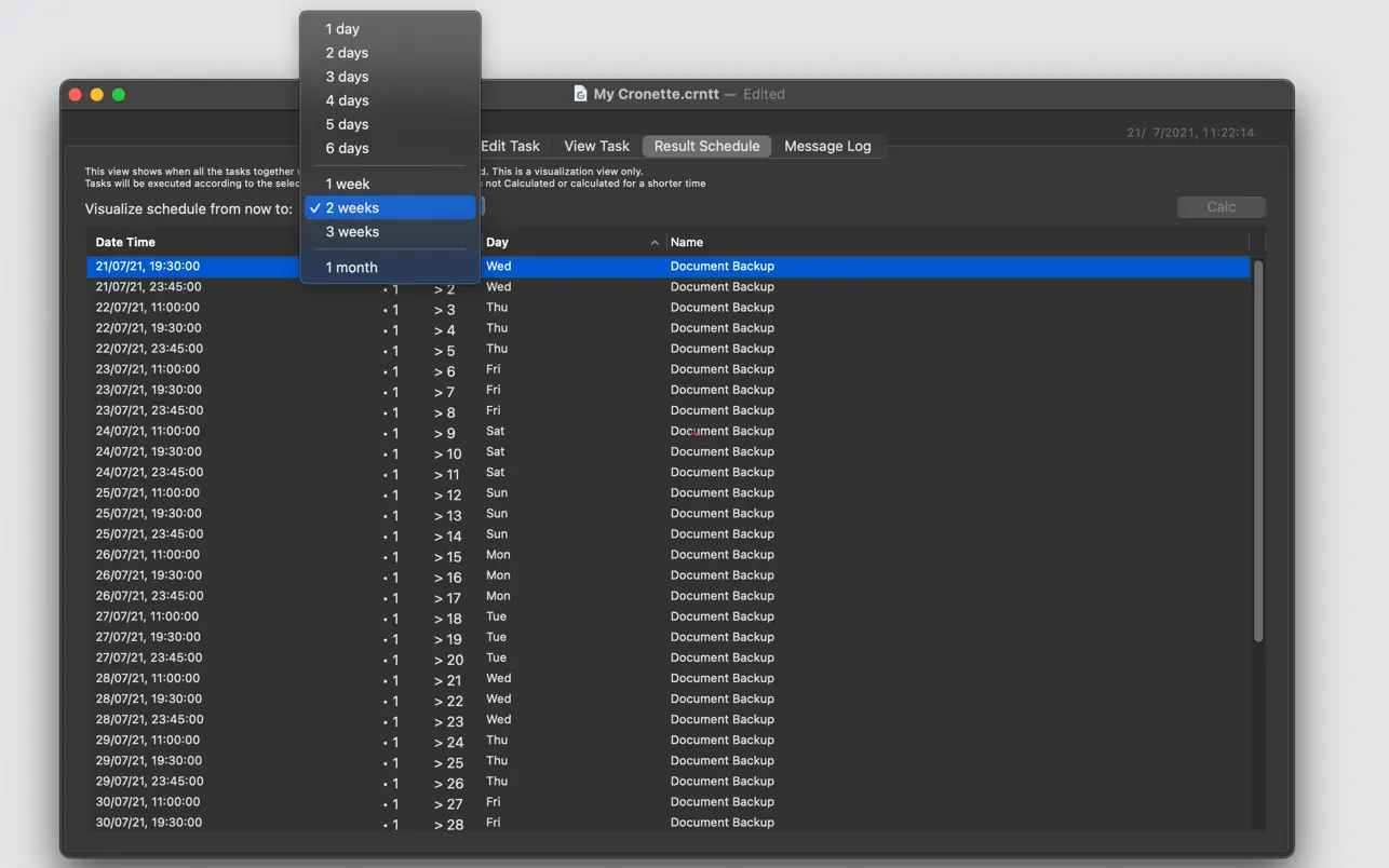Подробнее о том, как это работает: все задачи внутри Cronette представлены в виде таблицы с документами. Задача визуализируется в главном и подробном интерфейсе (хорошо известный макет, используемый во множестве программного обеспечения Mac, пользователь выбирает задачу в главной таблице, и он может видеть и редактировать детали, отображаемые под таблицей) Ключевые особенности:
