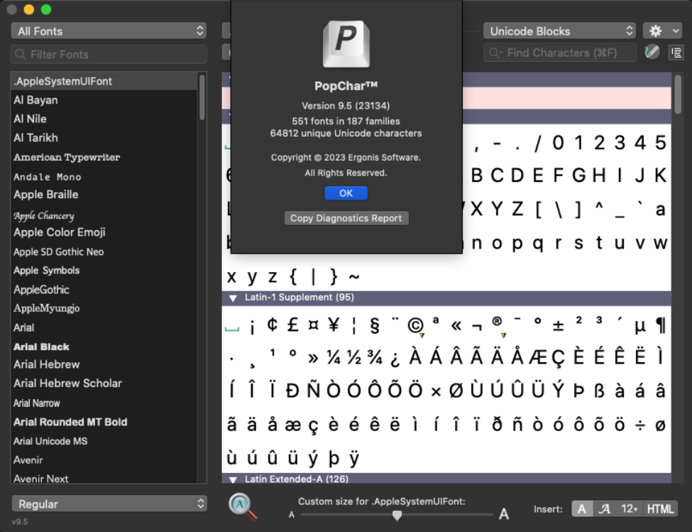 Усовершенствованные возможности поиска PopChar помогут вам найти то, что вы ищете, независимо от того, нужно ли вам искать символ по имени, определить шрифты, содержащие определенные символы, или изучить весь набор символов шрифта. Установка: Запускаем кейген (cr-ergonis.dmg) выбираем нужное приложение, генеритруем ключ, в приложении нажимаем на шестерню > выбираем Registration и вставляем туда полученный ключ. Скриншоты: