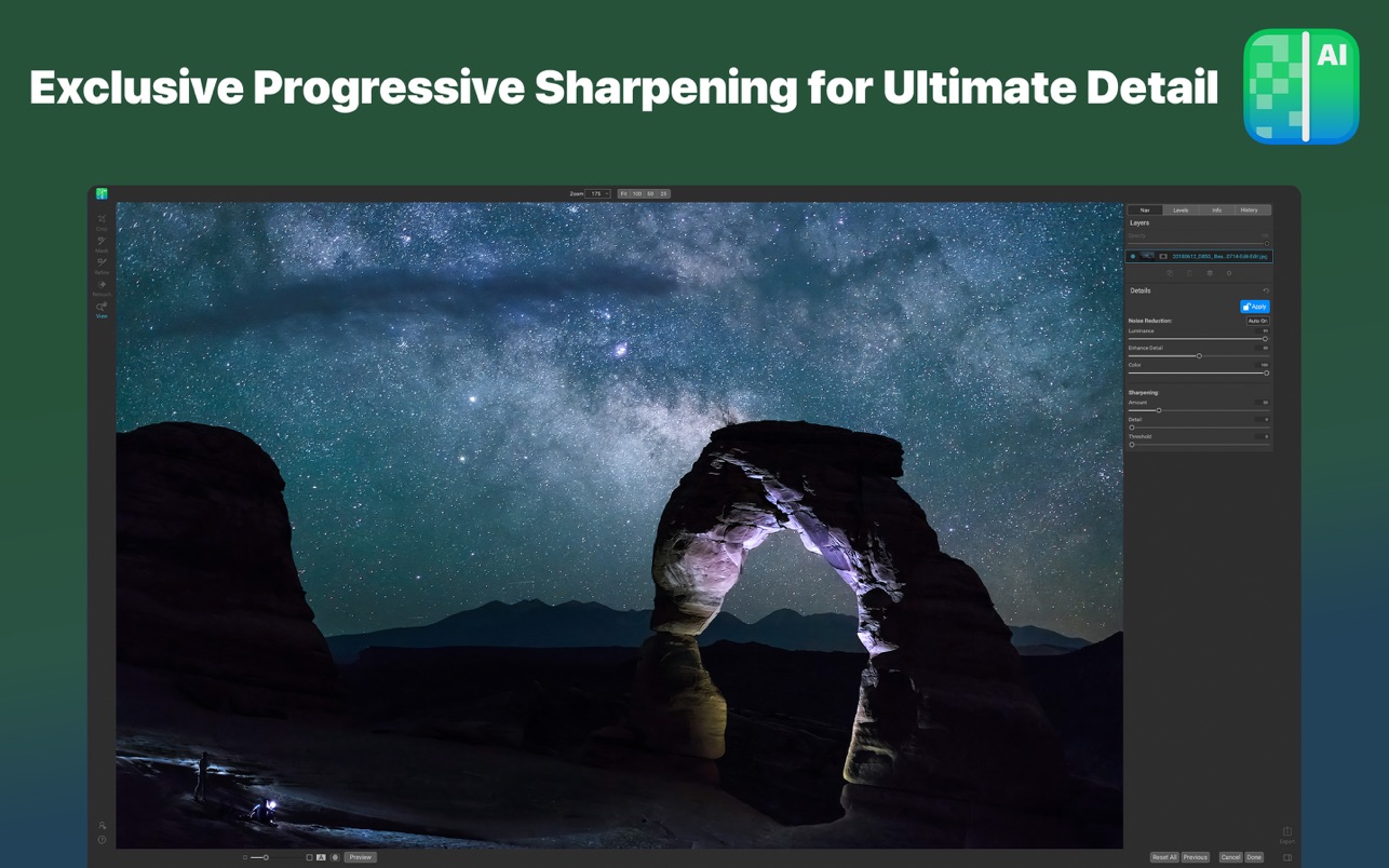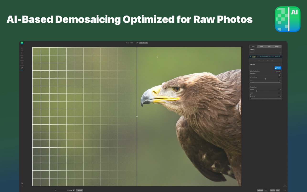 Системные требования: macOS 10.15 и новее Описание: ON1 NoNoise AI — лучшее программное обеспечение для шумоподавления ваших фотографий. Быстро удаляйте шум и получайте самые четкие детали на своих фотографиях с помощью технологии на базе искусственного интеллекта. ON1 NoNoise AI будет интеллектуально удалять шум изображения, а также восстанавливать и улучшать детали. Он интегрируется в ваш рабочий процесс, поддерживая распространенные фоторедакторы и форматы файлов, включая сохранение необработанных файлов DNG, которые поддерживают полный тональный и цветовой диапазон. Шумоподавление на основе ИИ Использует передовые технологии машинного обучения для создания сети ИИ для устранения яркостного и цветового шума, сохраняя при этом детали, как ни одно другое приложение, дающее превосходные результаты. Демозаика на основе ИИ Для необработанных фотографий большая часть шума возникает в процессе демозаики. Сочетание этого шага с шумоподавлением во время обучения ИИ в ON1 NoNoise AI позволит добиться как лучшего шумоподавления, так и помочь повысить детализацию и резкость. Демозаика на основе ИИ Включает эксклюзивный алгоритм прогрессивной резкости ON1 для повышения резкости и детализации в зависимости от размера деталей на фотографии без ореолов и артефактов, которые могут создавать другие методы повышения резкости. Сверхбыстрый предварительный просмотр настроек в реальном времени Результаты можно просматривать лишь за долю времени, которое требуется другим приложениям для получения видимых результатов. Также гораздо меньше элементов управления для настройки без ограничения резкости, чтобы уменьшить шум изображения. Скриншоты: