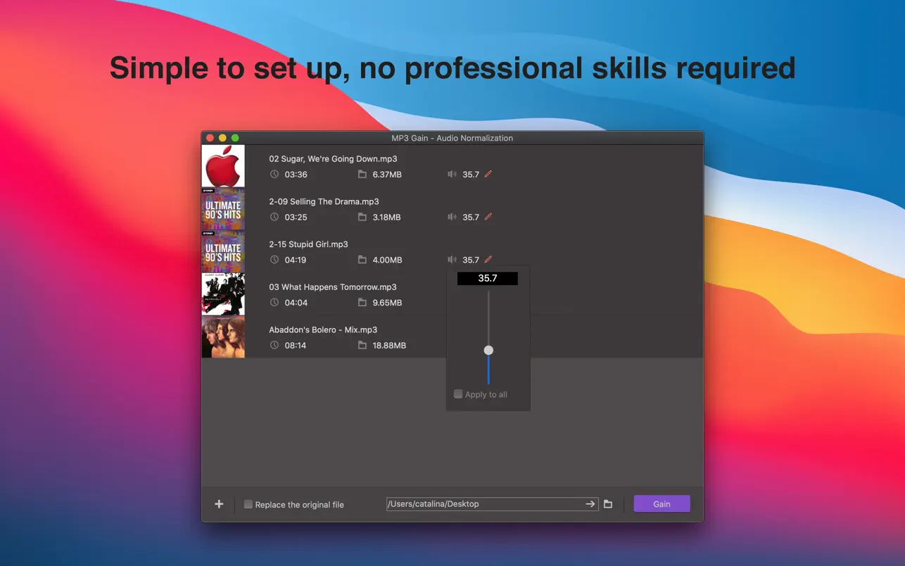 Описание: MP3 Gain для Mac — это простой инструмент, разработанный специально для регулировки и нормализации громкости аудиофайлов (mp3, wma и т. д.). Он автоматически нормализует громкость аудиофайлов и регулирует громкость звуковых дорожек без потерь. Он выполняет статистический анализ, чтобы определить, насколько громко файл на самом деле звучит для человеческого уха. Ключевые особенности: