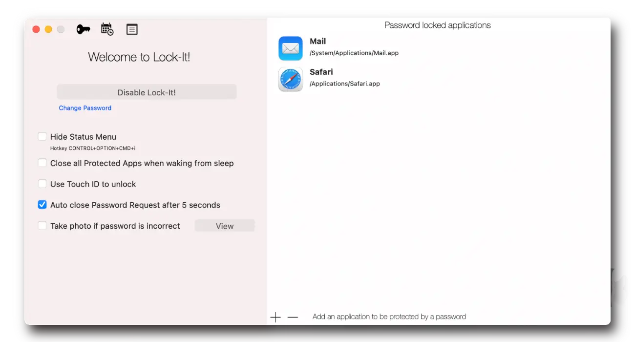 Lock-It! является фоновым процессом и не использует системные ресурсы. Поддержка Touch ID