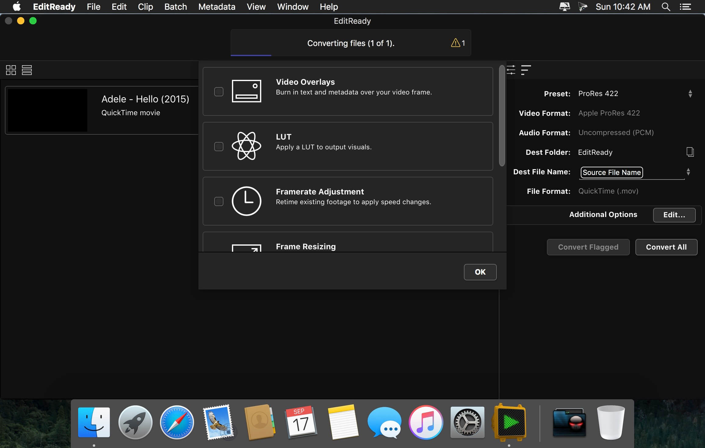 Процессор: 64-разрядный процессор Описание: EditReady обеспечивает простое, быстрое и мощное транскодирование для профессионалов в области видео, без перегруженного интерфейса и устаревших вариантов выбора формата. Видеофайлы MOV, MP4 и MXF можно быстро преобразовать в готовые к редактированию фильмы в форматах ProRes или DNxHD. Особенности: - Больше, чем просто транскодирование - Помимо транскодирования в профессиональные форматы ProRes, DNxHD и H.264, EditReady позволяет легко подготовить отснятый материал к просмотру и монтажу. Во время конвертирования к видео можно применить LUT-файлы для придания ему определенного вида или преобразовать лог-файлы в линейные. EditReady также позволяет переопределить частоту кадров в конвертированных файлах, что позволяет добиться идеального замедленного воспроизведения видео в формате 60p или 120p. - Интеллектуальное редактирование метаданных - EditReady предоставляет возможность просмотра и редактирования метаданных. Современные камеры хранят данные GPS, настройки объектива, диагностические данные и многое другое. Можно вручную добавить данные о местоположении, если камера их не сохранила, или задать имя ролика для всех файлов. Можно даже использовать метаданные для создания имен файлов при транскодировании. - Современный, молниеносный, готовый к будущему - EditReady разработан с учетом всех возможностей современных компьютеров Mac. Он использует аппаратное ускорение декодирования видео, обработку изображений OpenCL и каждый свободный цикл процессора. Кроме того, EditReady ориентирован на будущее - он готов к работе с новыми форматами и рабочими процессами. Скриншоты: