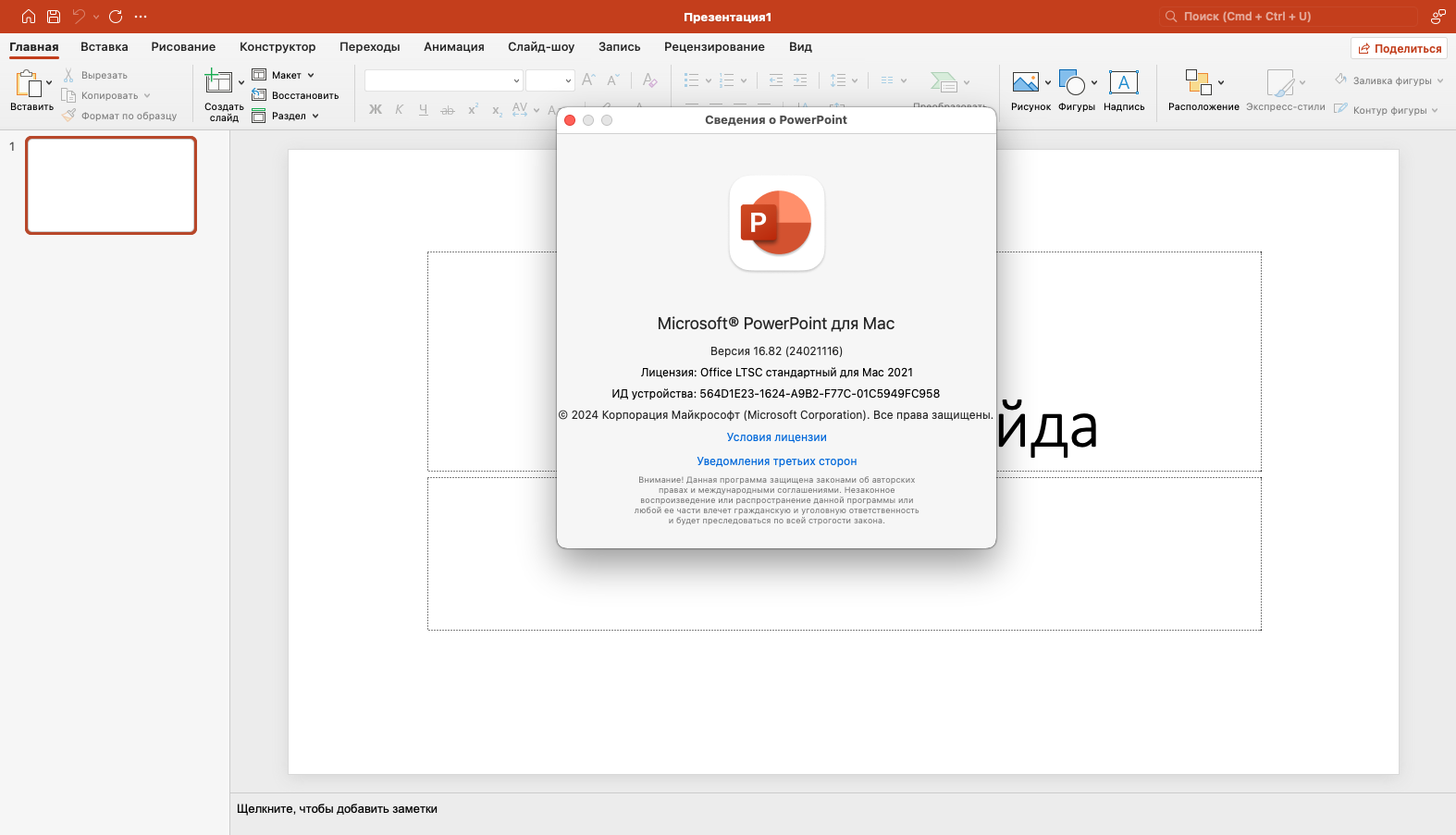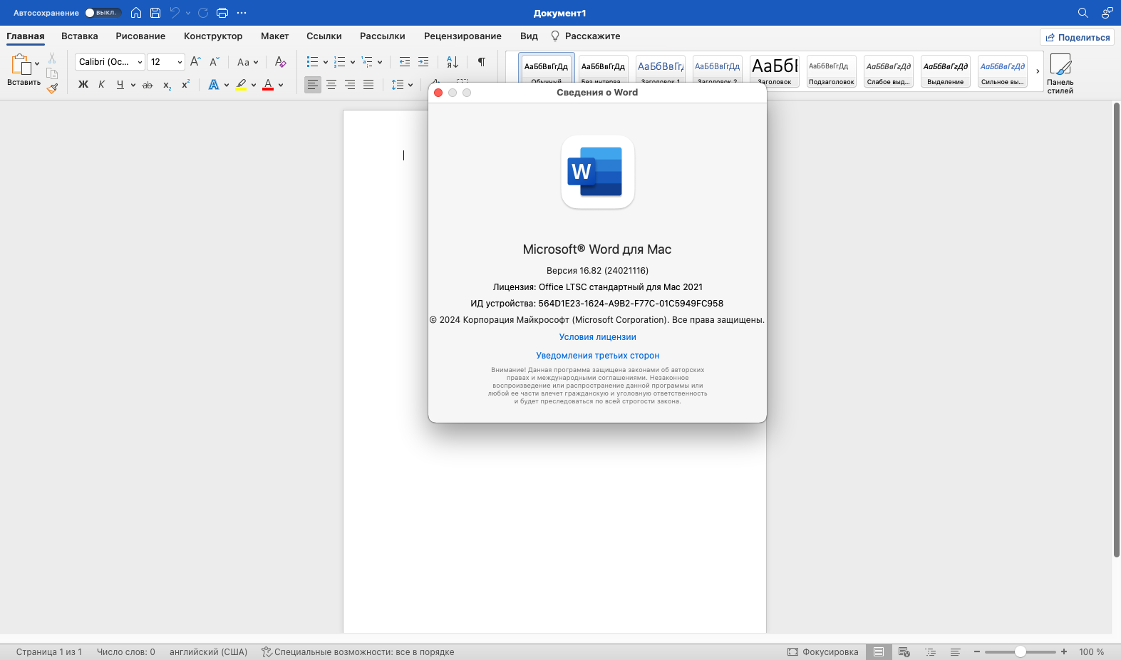 Microsoft Office 2021 Год выпуска: 2024 Версия: 16.82 (24021116) Разработчик: Microsoft Corporation Платформа: Intel/Apple Silicon Universal Язык интерфейса: Русский, English, العربية, 中文, Čeština, Dansk, Nederlands, Suomi, Français, Deutsch, Ελληνικά, עברית, Magyar, Bahasa Indonesia, Italiano, 日本語, 한국어, Norsk, Polski, Português, Slovenčina, Español, Svenska, ภาษาไทย, Türkçe Таблэтка: Патч Системные требования: