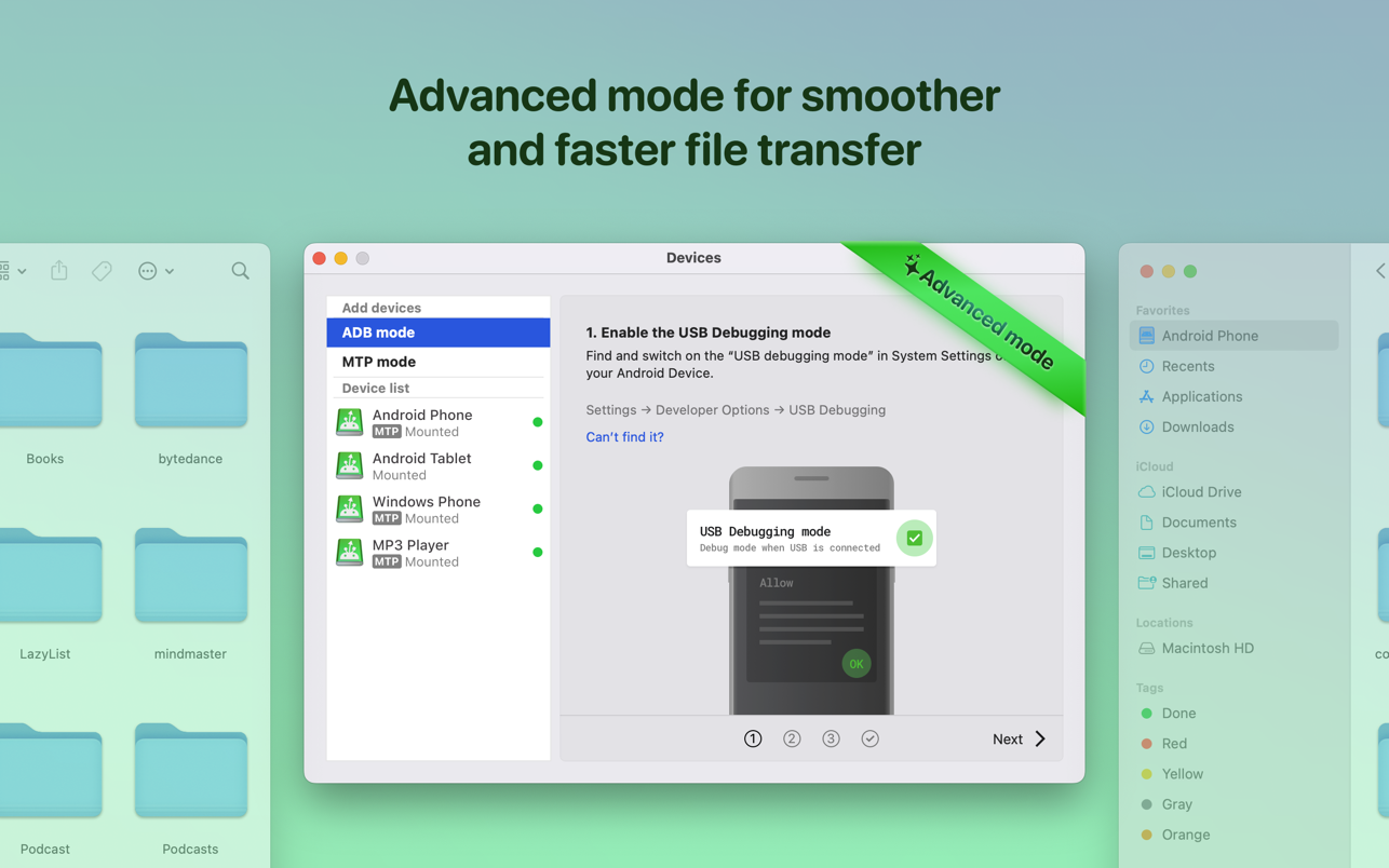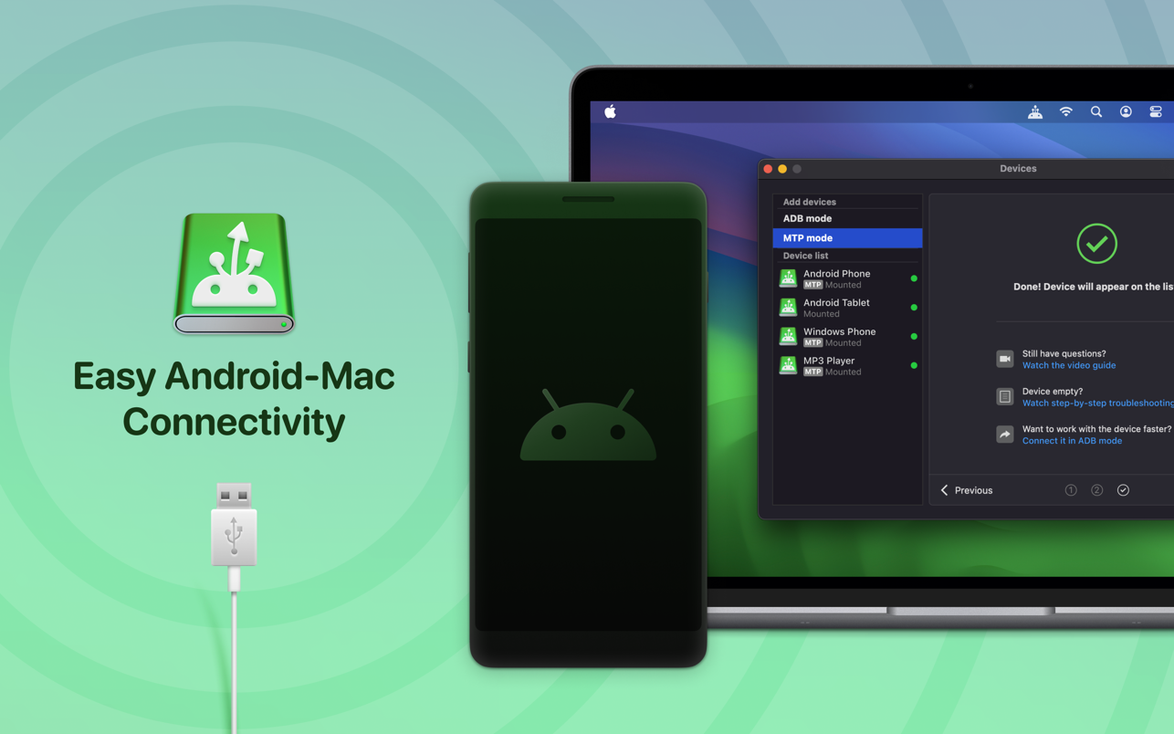 Описание: Приложение MacDroid — очень полезное решение для тех, кто использует Mac или MacBook, в то же время предпочитая Android-устройство iPhone. Android и macOS изначально не могут работать вместе, поэтому крайне необходим интерфейс, который не только соединял бы две системы, но и обеспечивал безопасную и бесперебойную передачу файлов между ними. С MacDroid вы получаете удобство подключения Mac и телефона или планшета Android и доступа к содержимому портативного устройства в Finder. Вы сможете передавать фотографии, музыку, видео, а также целые папки. Вам понадобится только кабель USB для подключения телефона к компьютеру, MacDroid позаботится обо всем остальном. Перенесите свои фотографии
