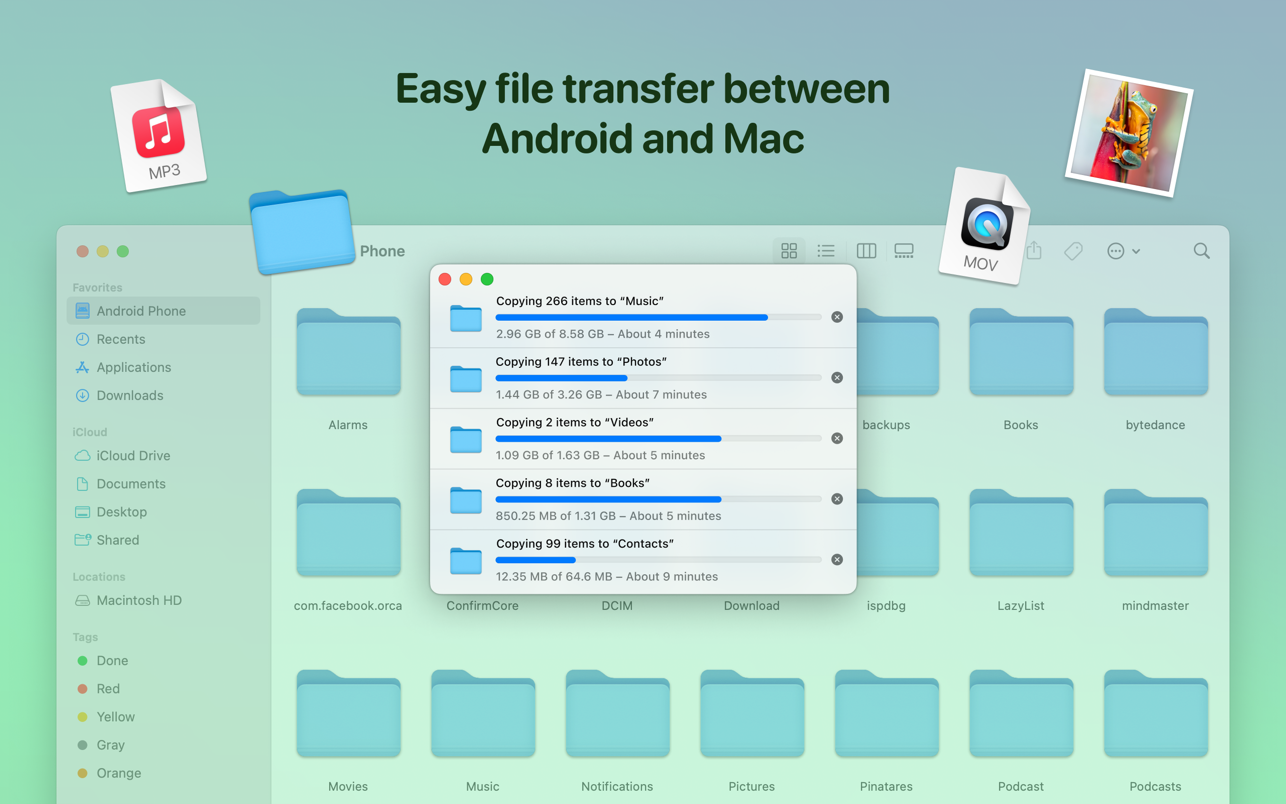 Вы можете получить доступ к своим фотографиям Android в приложении Finder и легко перетащить их с помощью курсора мыши в любую папку на вашем Mac. Перенос музыки на телефон