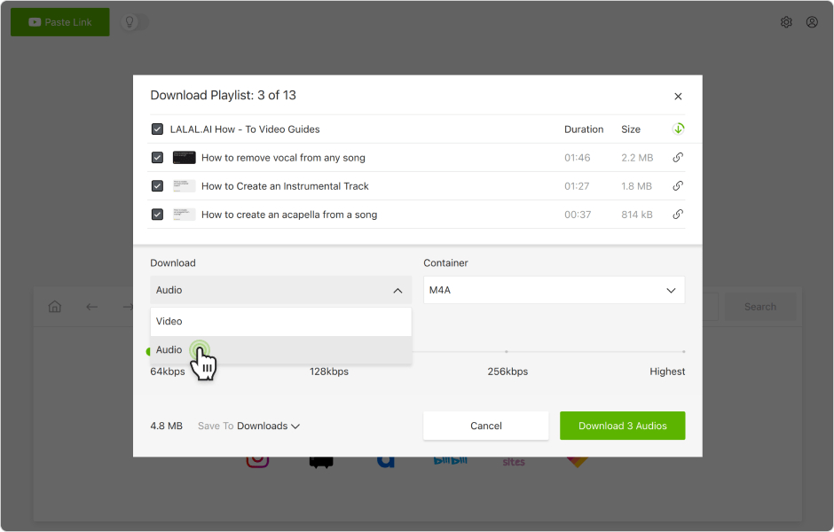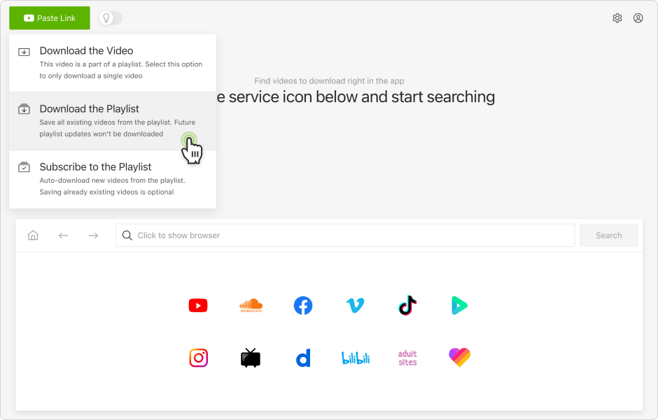 Загружайте видео, музыку и плейлисты в любом удобном для вас формате.