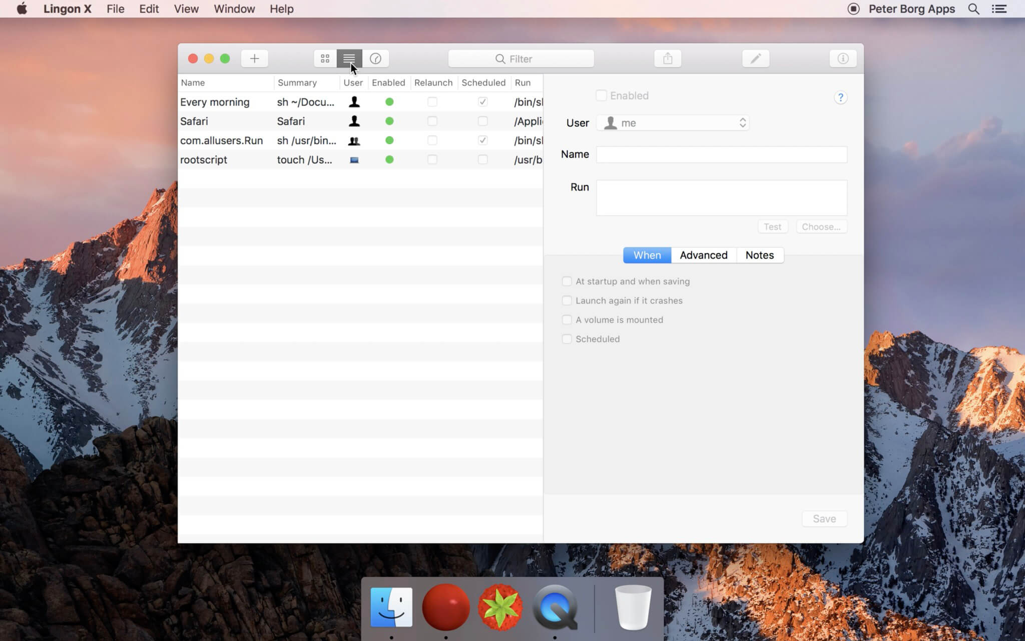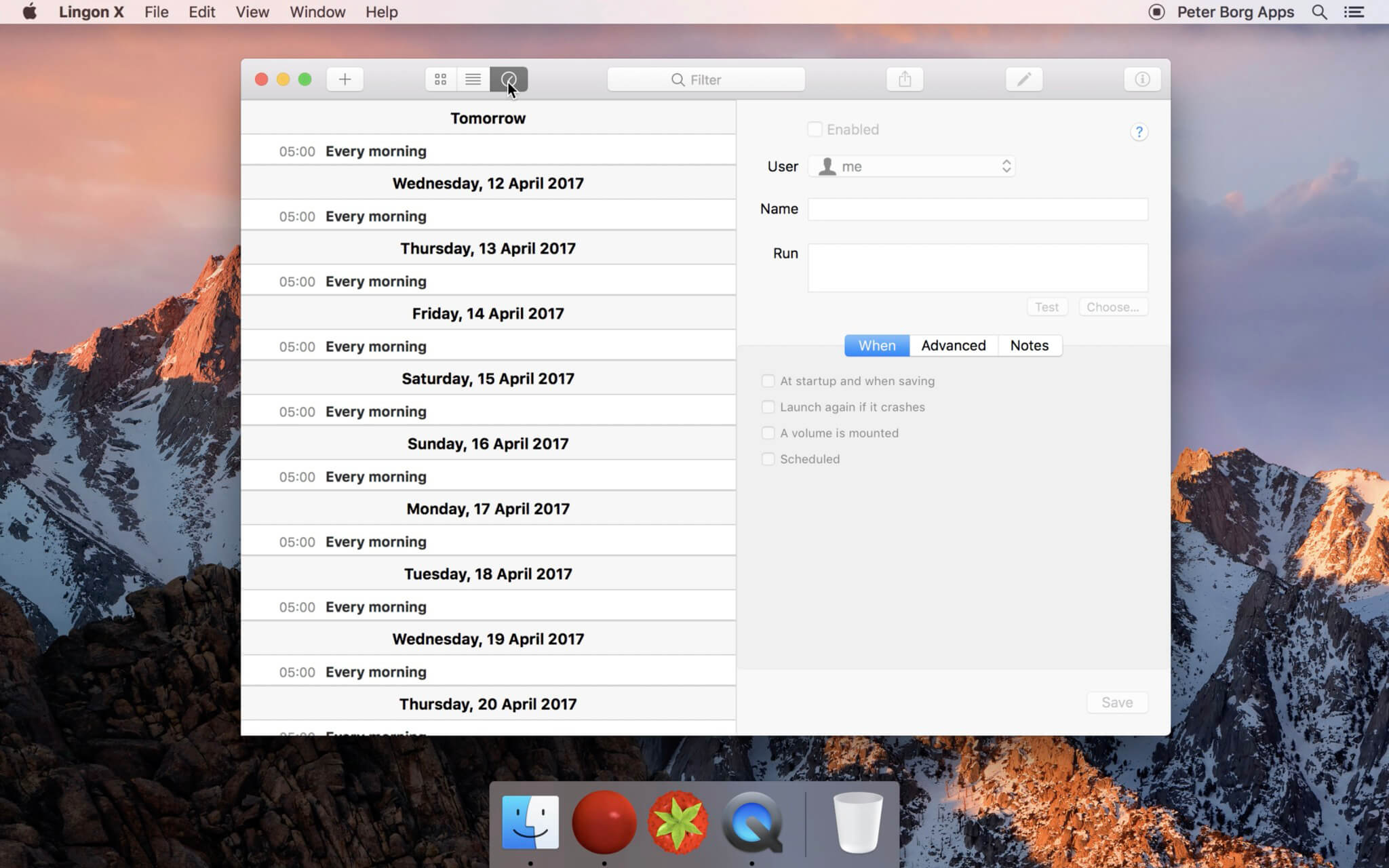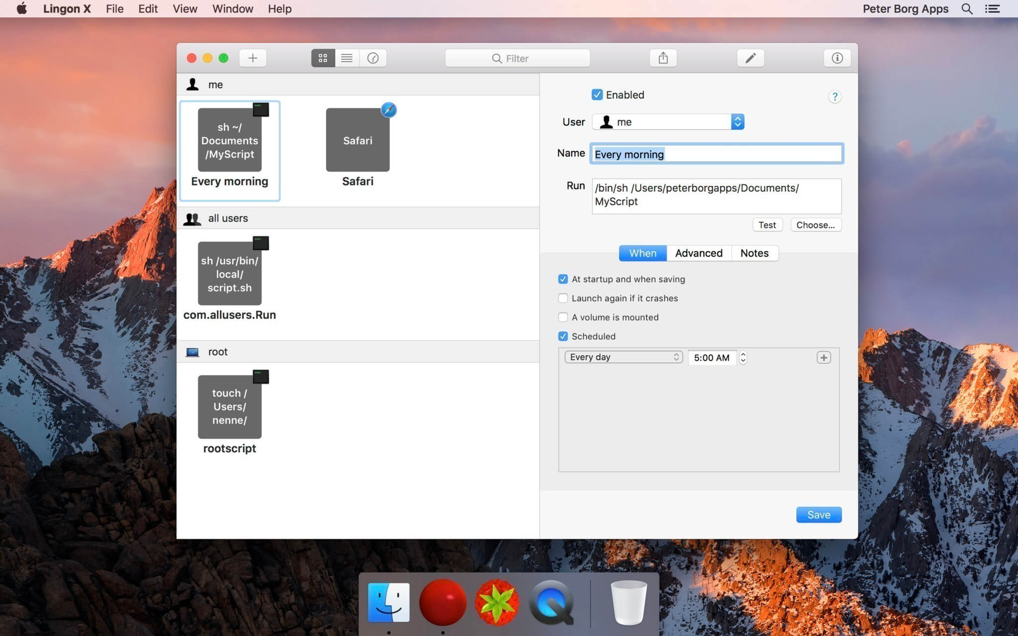 Описание: Lingon позволяет запускать приложение, скрипт или команду в любое заданное время. Вы можете настроить запуск по расписанию, регулярно или при наступлении определённых событий. Он также может автоматически перезапускать приложение или скрипт, если они неожиданно завершат работу. Lingon невероятно прост в использовании, но при этом очень мощный. Это полноценный редактор launchd с множеством продвинутых функций, включая запуск заданий от имени root и просмотр логов для каждого задания. Приложение может работать в фоне, отслеживать все задания и показывать уведомления при любых изменениях. Lingon X 9 — лучшая версия на сегодняшний день с множеством новых функций и улучшений: