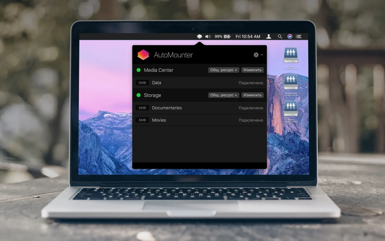 AutoMounter - это элегантный и мощный элемент меню, предназначенный для автоматического монтирования общих сетевых ресурсов. ОСОБЕННОСТИ