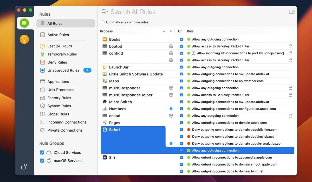 С помощью Little Snitch вы сможете в реальном времени следить за любыми исходящими подключениями и одним программам разрешать подключаться, а другим запрещать подключения, внося их в своеобразный внутренний список Little Snitch или говоря техническим языком, создавая свод правил на базе которых Little Snitch будет открывать или закрывать исходящий доступ для программ, установленных на вашем Mac. Утилита просто необходима при первом запуске неизвестных программ. Также она часто используется любителями warez-софта для блокировки оповещения, когда приложение хочет передать о себе сведения на домашний сервер. Что нового в версии: