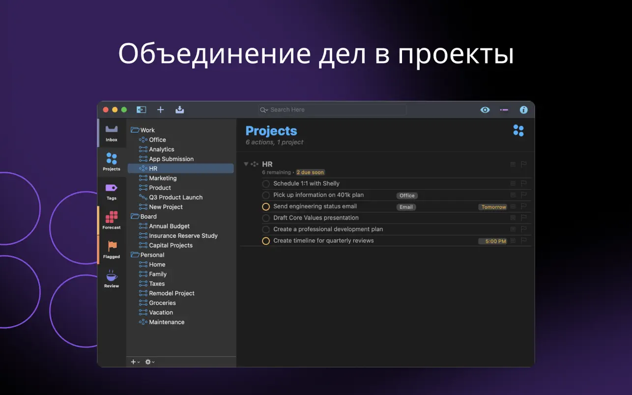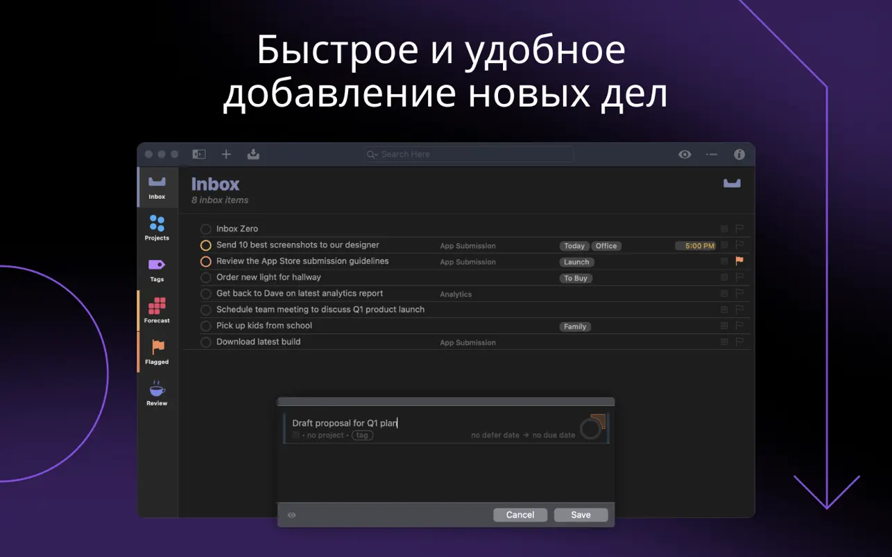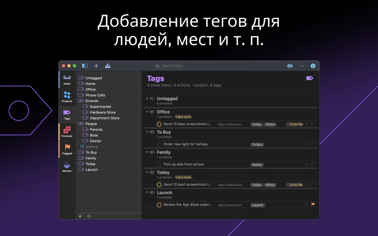 Описание: OmniFocus - это приложение-органайзер. В нем используются проекты для естественной организации задач, а затем добавляются теги для упорядочивания всех проектов. Легко вводить задачи, когда вы находитесь в пути, и обрабатывать их, когда у вас есть время. Чтобы составить план на день, используйте вид "Прогноз", который показывает как задачи, так и события календаря. Используйте перспективу "Обзор", чтобы следить за выполнением проектов и задач. Используйте OmniFocus, чтобы каждый день добиваться большего. Создавайте проекты и задачи, упорядочивайте их с помощью тегов, концентрируйтесь на том, что можно сделать прямо сейчас, и добивайтесь результата. А наша бесплатная система синхронизации обеспечит сохранность ваших данных на всех компьютерах Mac. (А также в OmniFocus для iOS, приобретается отдельно). Поскольку ваши данные зашифрованы, они находятся в безопасности в облаке. Что нового: