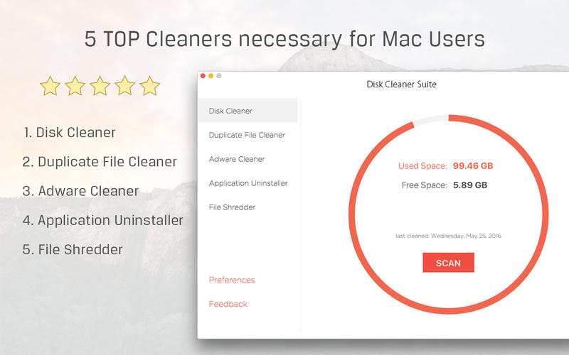 Описание: 5 лучших очистителей, необходимых пользователям Mac. Disk Cleaner / Adware Cleaner / Duplicate File Cleaner / Application Uninstaller / File Shredder Функции: