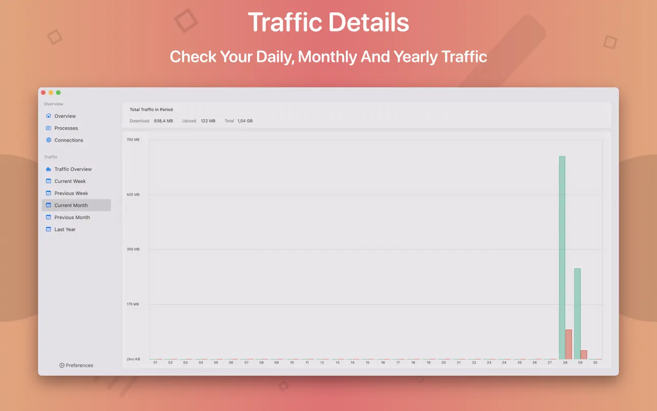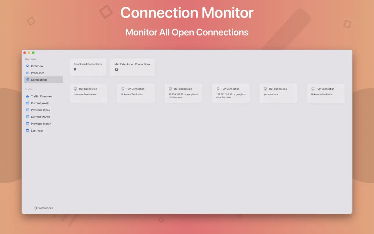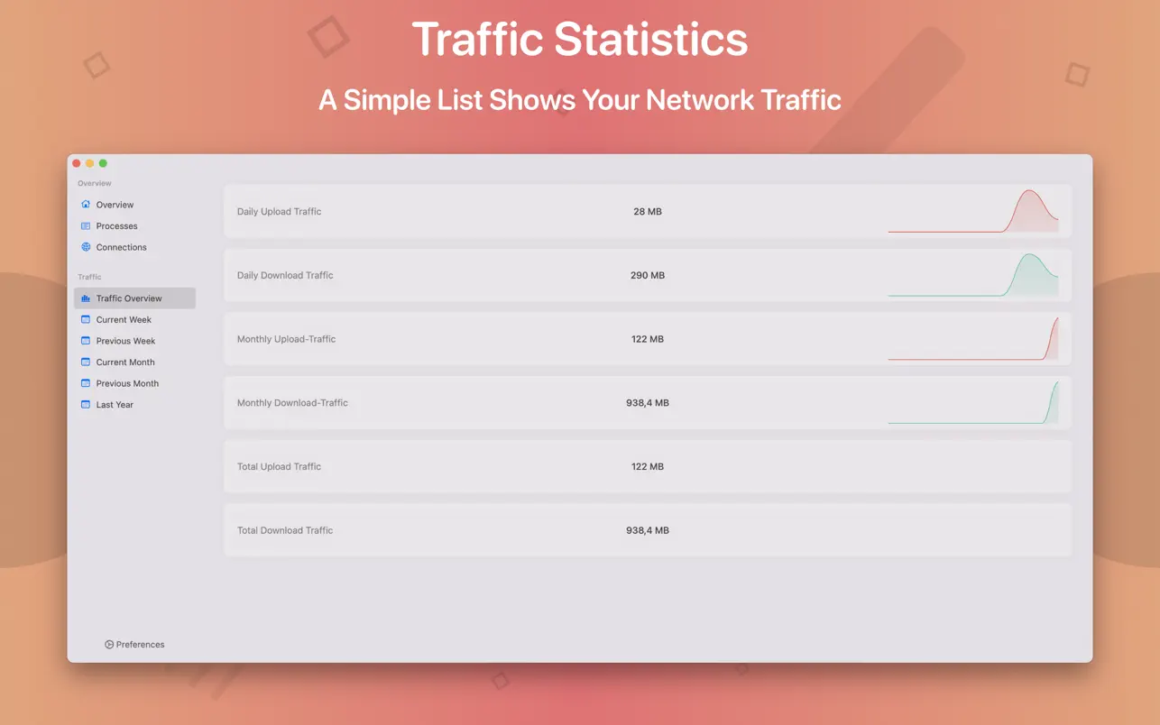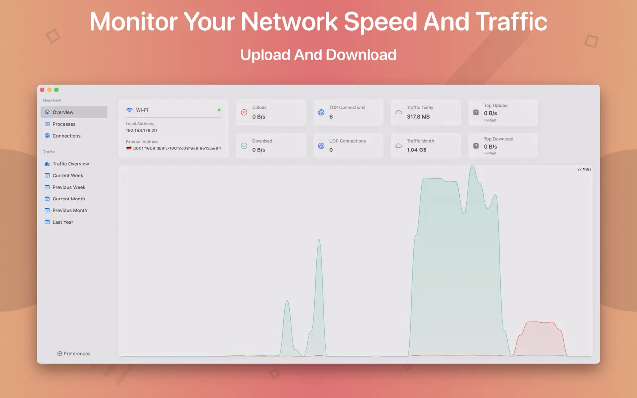 Использование сети: категория сети показывает текущую скорость загрузки и выгрузки, а также количество открытых подключений.