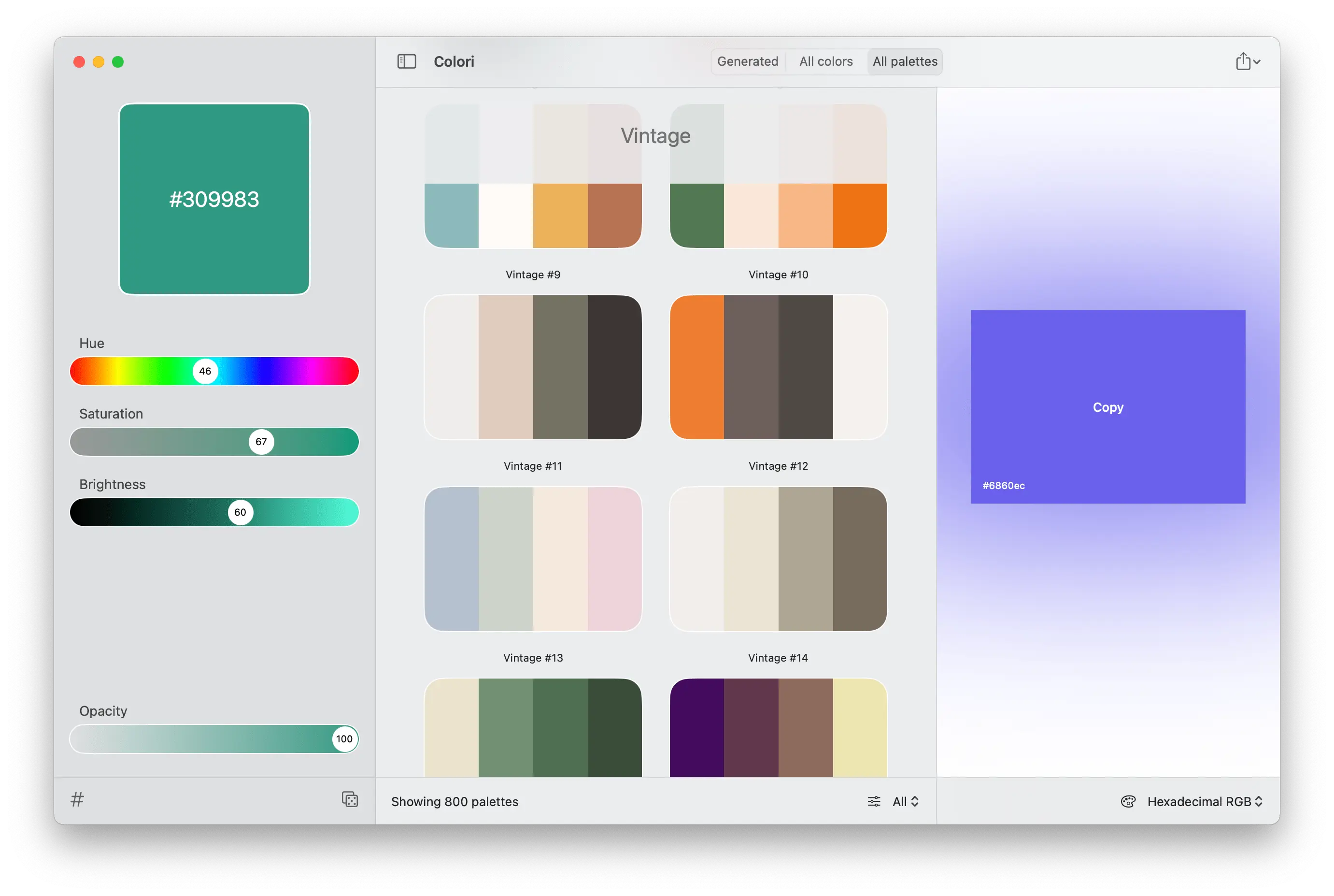 - Множество вариантов: Работайте элегантно и молниеносно с вашего Mac. Хотите экспортировать палитры для использования, например, в веб-дизайне и CSS/LESS/SASS? Готово!