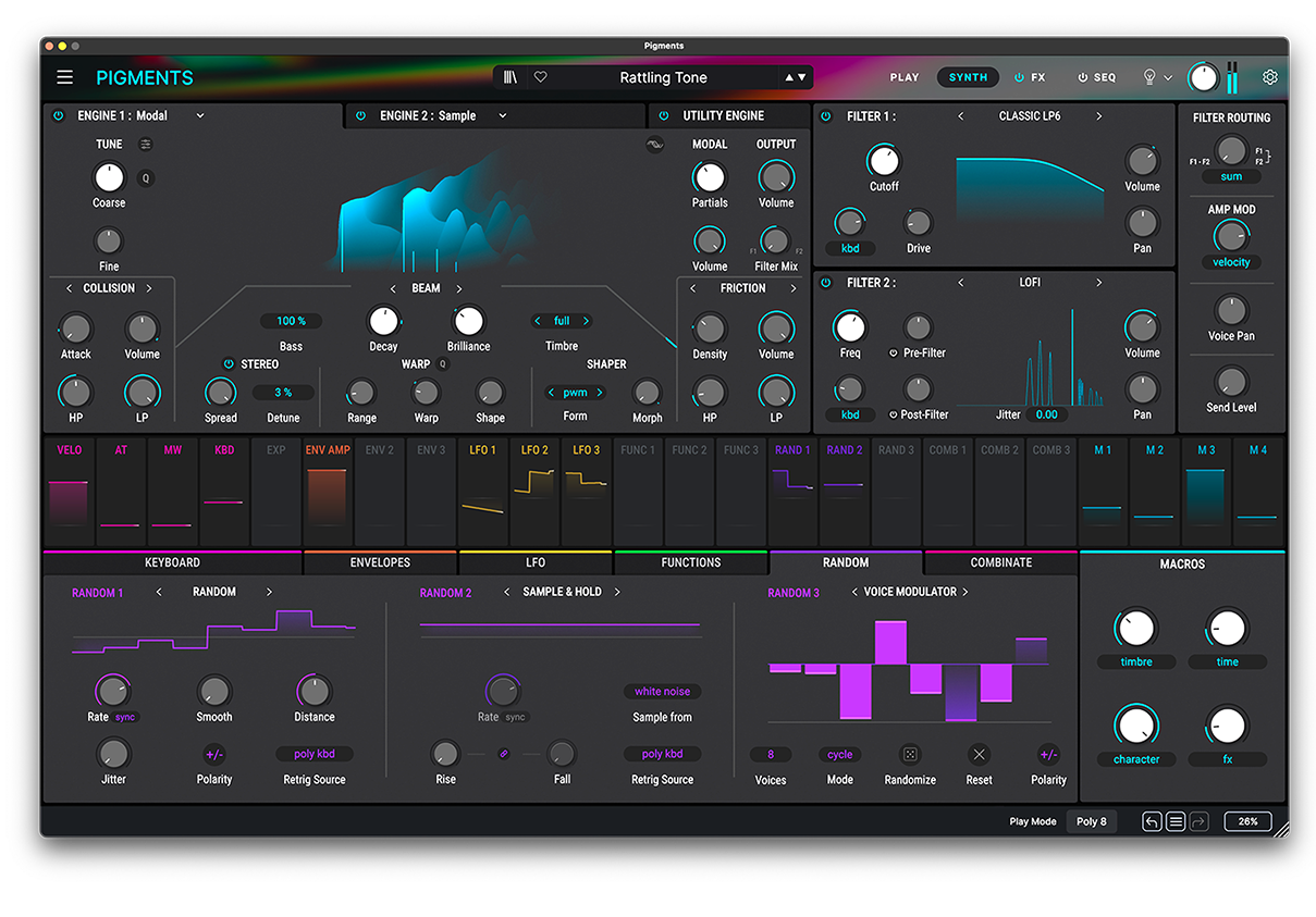 Pigments имеет двойной аудио движок, позволяющий вам смешивать виртуальные аналоговые и таблично-волновые волновые осцилляторы, чтобы создать идеальную отправную точку для вашего патча. Вы можете даже изменять волновые таблицы или импортировать свои собственные. Что вы получите дальше, зависит от вас. Поэкспериментируйте с 3 огибающими, 3 LFO и 3 функциональными осцилляторами. Назначьте модуляторы, чтобы оживить ваш звук и вдохнуть в него жизнь. Добавьте контролируемые или совершенно неожиданные случайные изменения к любому параметру с помощью генератора вероятности Тьюринга. Пропустите сигнал через 2 фильтра с любой комбинацией культовых аналоговых фильтров или современных форматных фильтров. Обработайте ваш патч захватывающими современными эффектами, такими как wavefolder и мультифильтр или винтажными студийными эффектами реверберации, задержки и эквалайзерами.
