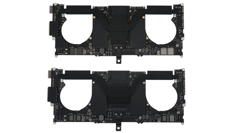 Вверху: логическая плата M1 Pro с радиатором большего размера. Внизу: логическая плата M2 Pro с меньшим радиатором.