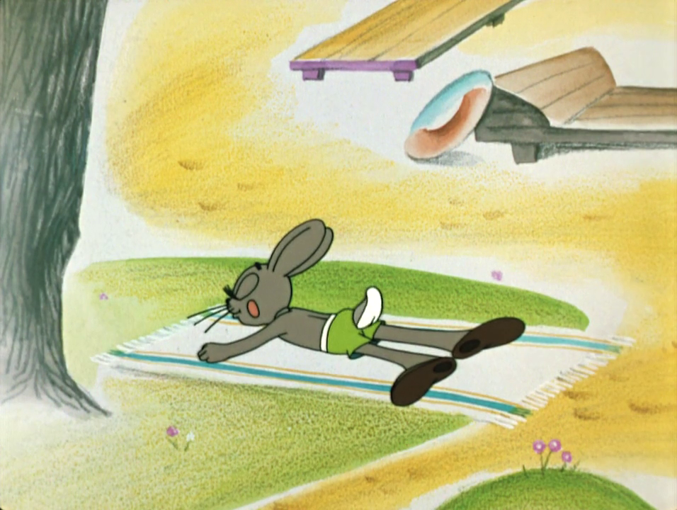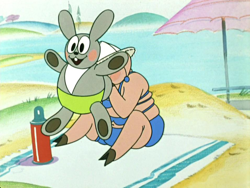 Description: Волк хулиганит замечает на балконе Зайца, поливающего цветы, представляет его жареным на блюде и желает достать его, чтобы съесть и Волк на пляже пытается поймать зайца, но в результате попадает в различные комические ситуации.