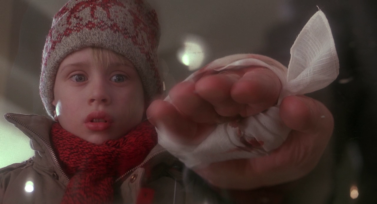 В сцене, где Гарри кусает палец Кевина, Джо Пеши на самом деле прикусил палец Калкина, оставив шрам на его пальце.
