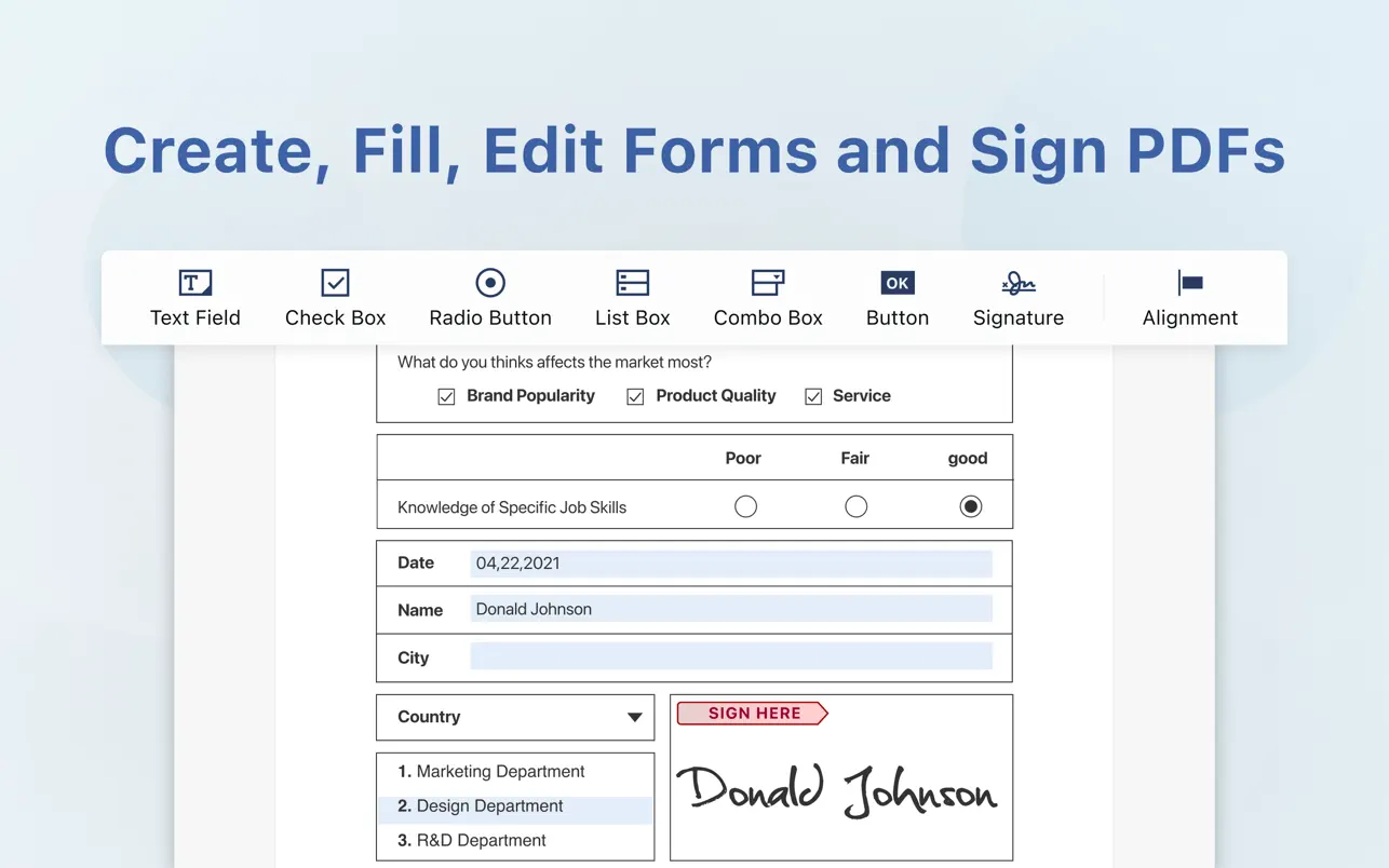 Создание и редактирование форм. Создавайте заполняемые PDF-формы из интерактивных полевых объектов, таких как кнопки, флажки, переключатели, списки и раскрывающиеся списки.