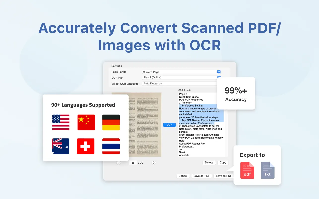 Преобразование отсканированных PDF-файлов или изображений в редактируемые и доступные для поиска файлы PDF или TXT. Поддерживается более 50 языков!