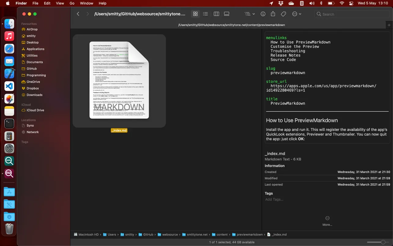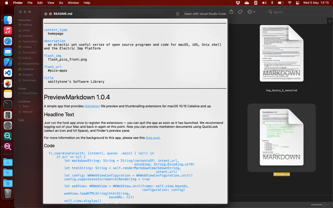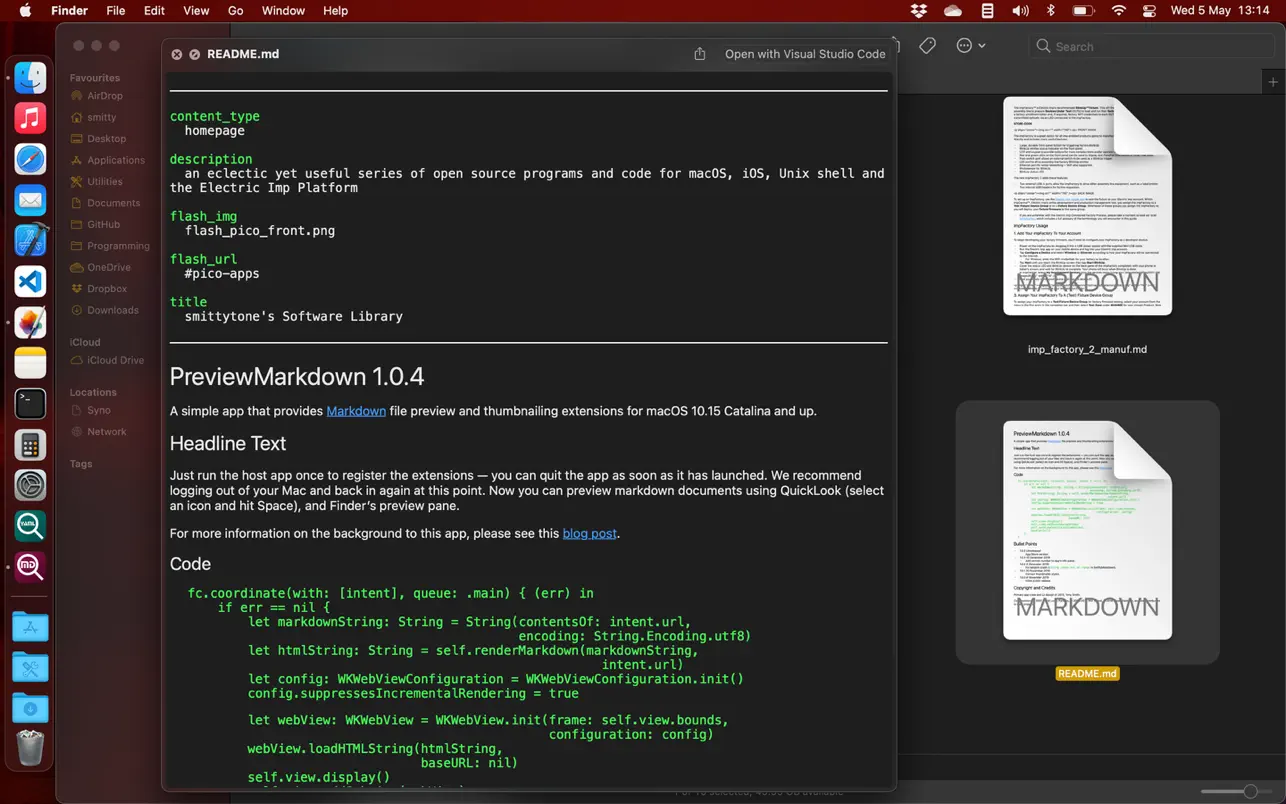 Описание: Удобный просмотр QuickLook и миниатюр значков в формате Markdown. PreviewMarkdown обеспечивает предварительный просмотр QuickLook и миниатюры значков файлов для документов, созданных с использованием популярного формата разметки Markdown. Приложение содержит два расширения: Previewer и Thumbnailer, которые можно просматривать и управлять ими в меню macOS "Системные настройки" > "Расширения". Само приложение является просто контейнером для этих расширений. Скриншоты:-