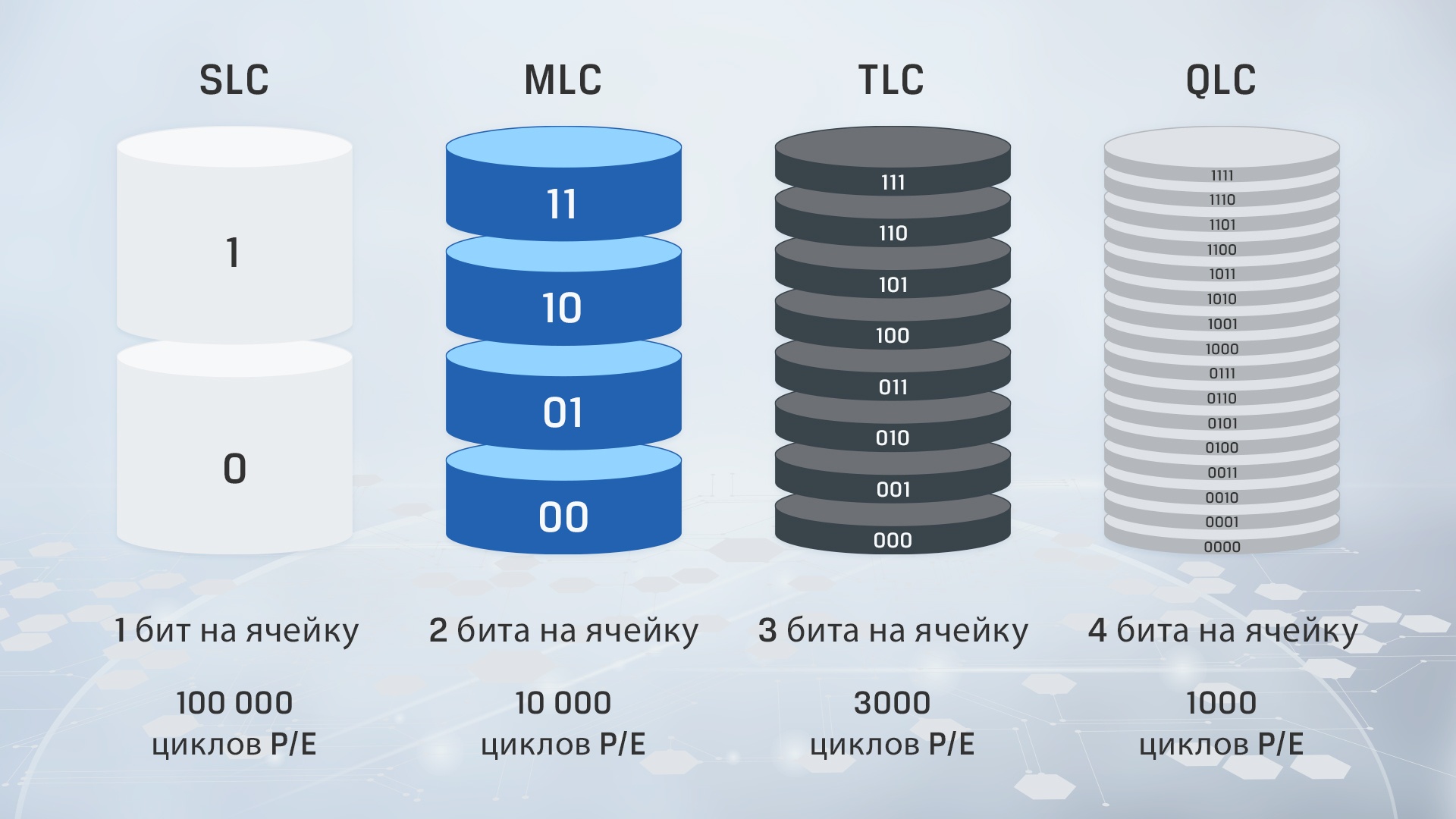 На рынке представлены несколько типов памяти NAND. Попросту говоря, каждый из типов отличается количеством битов, которое может храниться в каждой ячейке. Биты представляют собой электрический заряд, который может содержать только одно из двух значений — 0 или 1 (вкл./выкл.).