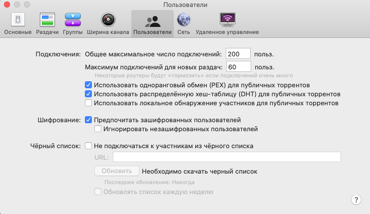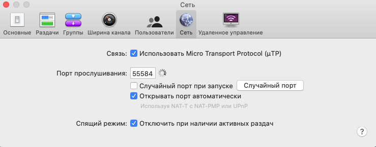 Настройки такие же. Включен штатный брандмауэр в макоси но для Transmission есть разрешение на входящие подключения. Transmission версия 3.00, он у меня в рутрекере работает без проблем