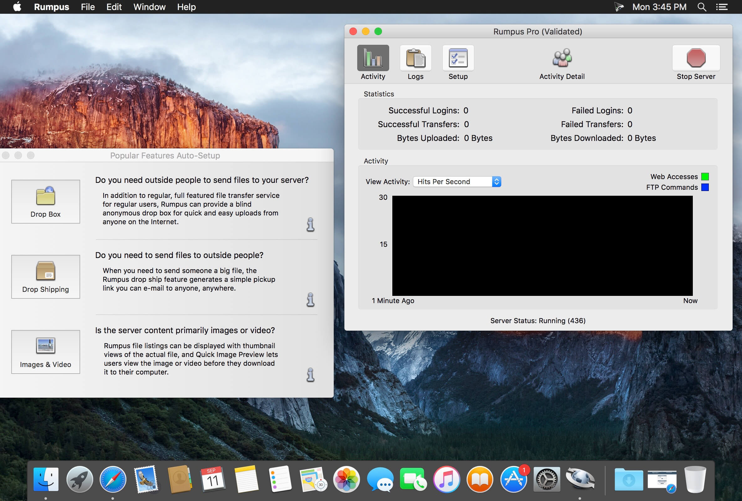 Среди ключевых особенностей - встроенные учетные записи пользователей, интегрированная передача файлов через Интернет, уведомление о загрузке файлов, широкие возможности обеспечения безопасности, высокая производительность и многое другое..... Также в комплект поставки входит монитор активности удаленного сервера Rumpus FileWatch и виджет серверной статистики RumpusStat. Производительность